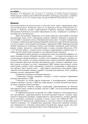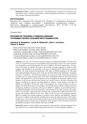КАРТАШОВА В. Н., МАКСИМУК Л. М., ЛЕВОНЮК Л. Е., КИСАРИН А. С. ОСОБЕННОСТИ ОБУЧЕНИЯ ИНОСТРАННОМУ ЯЗЫКУ МЛАДШИХ ШКОЛЬНИКОВ С ОГРАНИЧЕННЫМИ ВОЗМОЖНОСТЯМИ ЗДОРОВЬЯ // ПСИХОЛОГИЯ ОБРАЗОВАНИЯ В ПОЛИКУЛЬТУРНОМ ПРОСТРАНСТВЕ. 2025. № 1 (69)