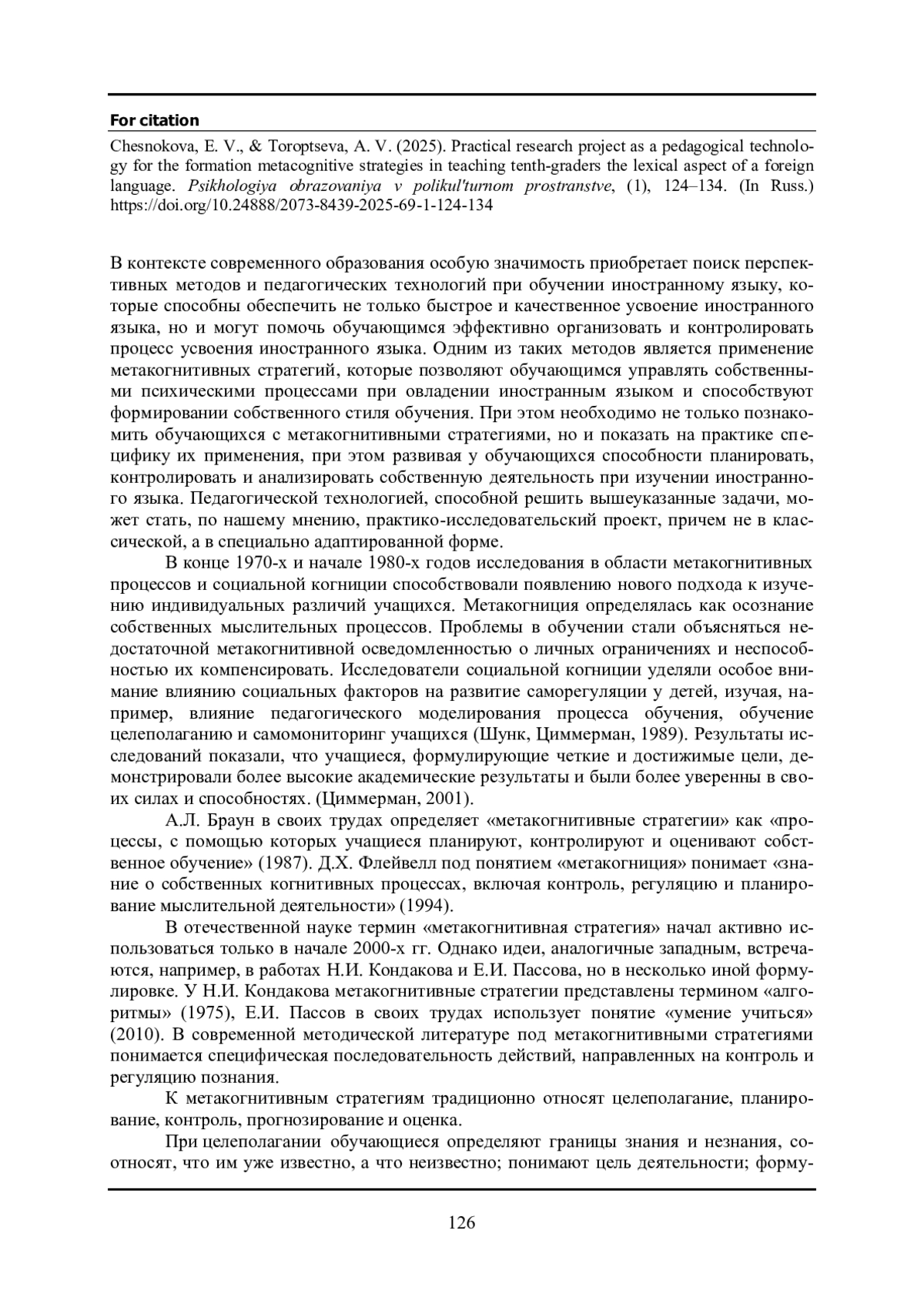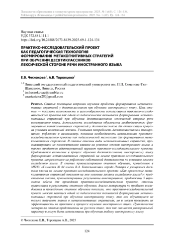 ЧЕСНОКОВА Е. В., ТОРОПЦЕВА А. В. ПРАКТИКО-ИССЛЕДОВАТЕЛЬСКИЙ ПРОЕКТ КАК ПЕДАГОГИЧЕСКАЯ ТЕХНОЛОГИЯ ФОРМИРОВАНИЯ МЕТАКОГНИТИВНЫХ СТРАТЕГИЙ ПРИ ОБУЧЕНИИ ДЕСЯТИКЛАССНИКОВ ЛЕКСИЧЕСКОЙ СТОРОНЕ РЕЧИ ИНОСТРАННОГО ЯЗЫКА // ПСИХОЛОГИЯ ОБРАЗОВАНИЯ В ПОЛИКУЛЬТУРНОМ ПРОСТРАНСТВЕ. 2025. № 1 (69)
