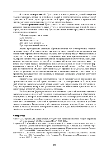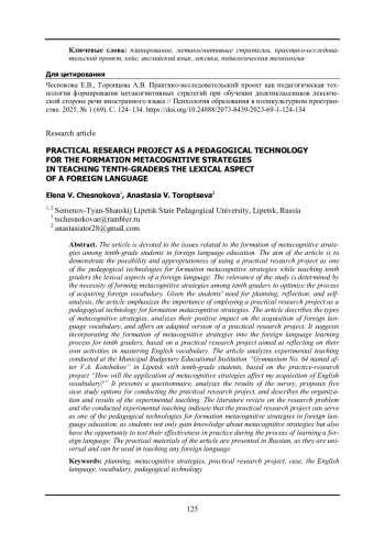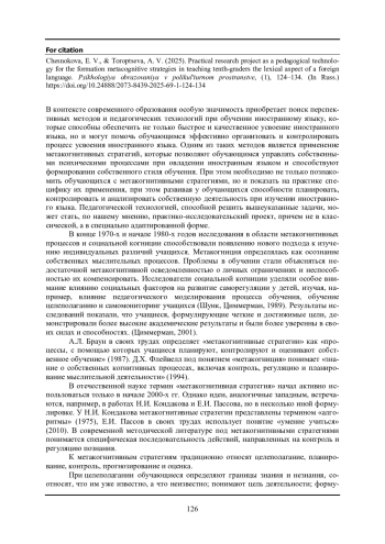 Статья: ПРАКТИКО-ИССЛЕДОВАТЕЛЬСКИЙ ПРОЕКТ КАК ПЕДАГОГИЧЕСКАЯ ТЕХНОЛОГИЯ ФОРМИРОВАНИЯ МЕТАКОГНИТИВНЫХ СТРАТЕГИЙ ПРИ ОБУЧЕНИИ ДЕСЯТИКЛАССНИКОВ ЛЕКСИЧЕСКОЙ СТОРОНЕ РЕЧИ ИНОСТРАННОГО ЯЗЫКА (2025)