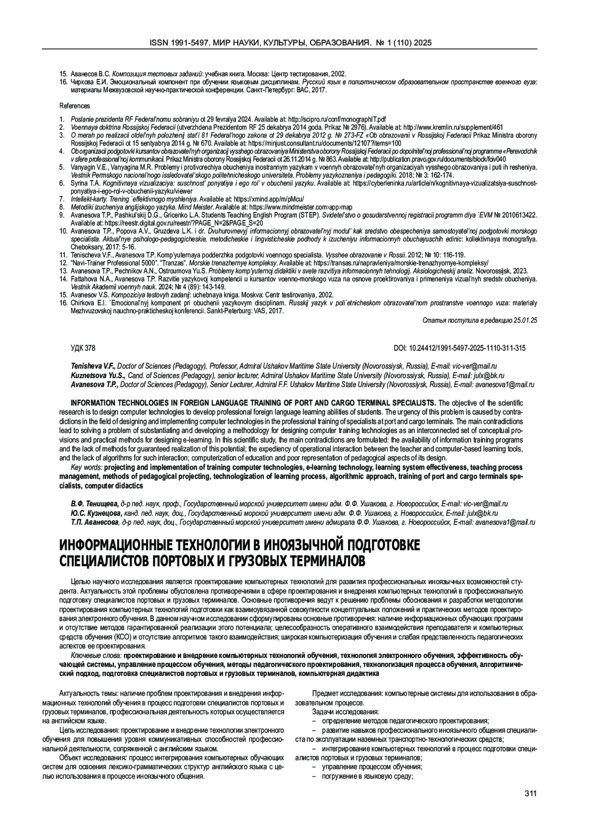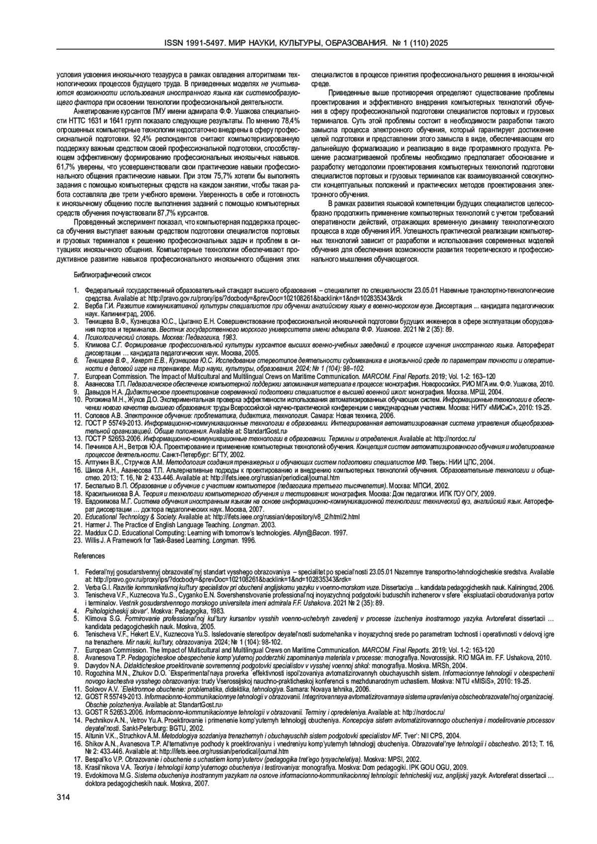 3. Тенищева В.Ф., Кузнецова Ю.С., Цыганко Е.Н. Совершенствование профессиональной иноязычной подготовки будущих инженеров в сфере эксплуатации оборудования портов и терминалов. Вестник государственного морского университета имени адмирала Ф.Ф. Ушакова. 2021 № 2 (35): 89. EDN: OHPBZE