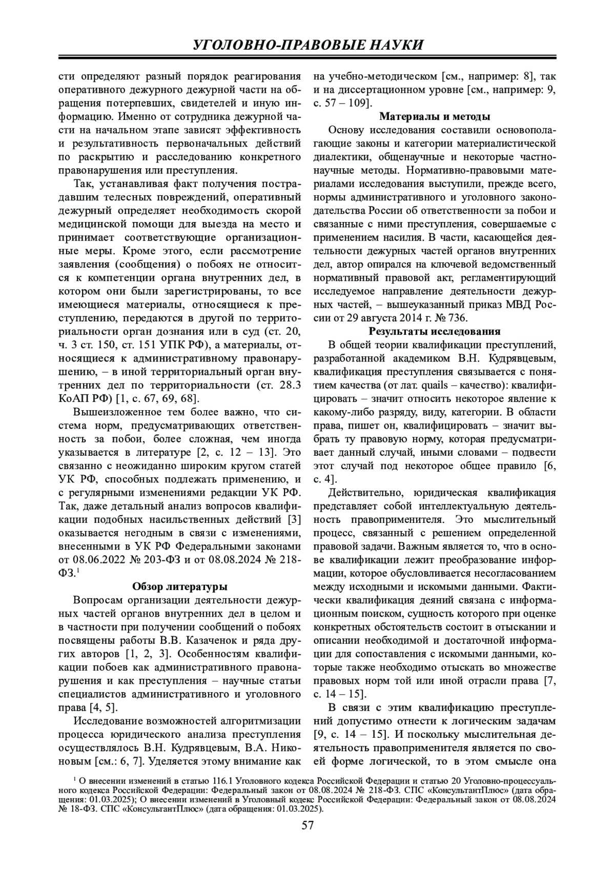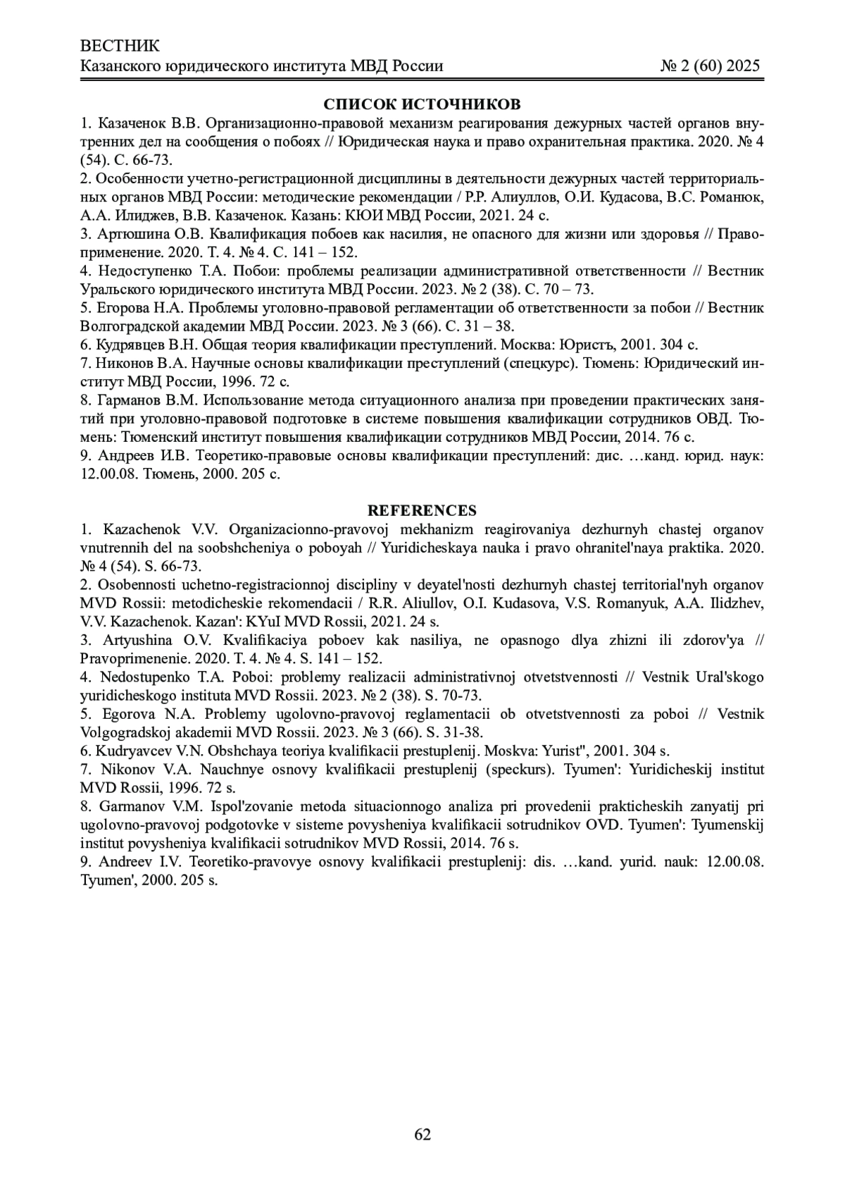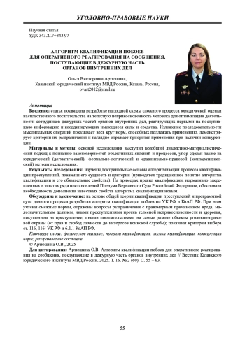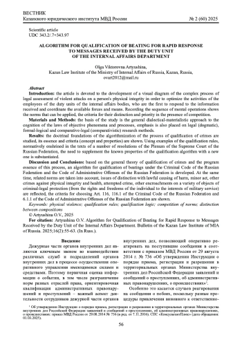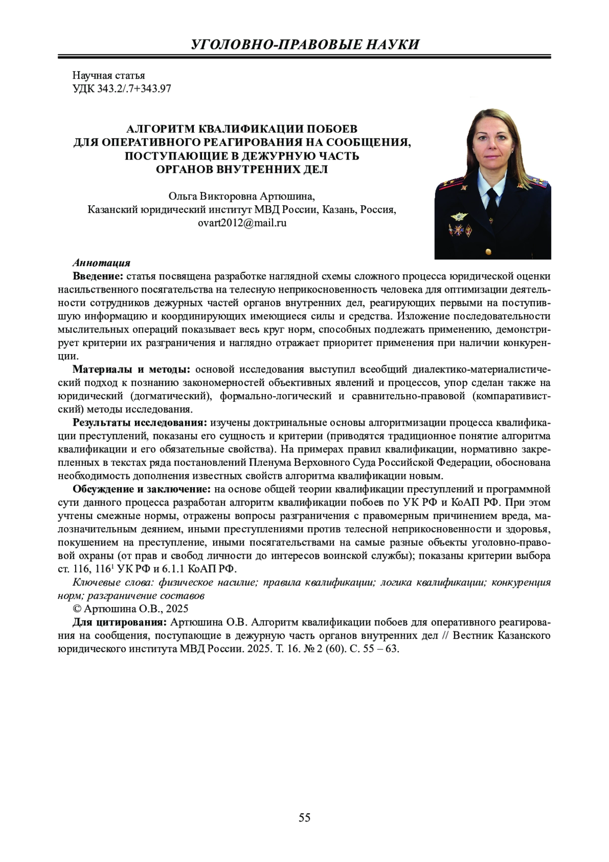 Статья: АЛГОРИТМ КВАЛИФИКАЦИИ ПОБОЕВ ДЛЯ ОПЕРАТИВНОГО РЕАГИРОВАНИЯ НА СООБЩЕНИЯ, ПОСТУПАЮЩИЕ В ДЕЖУРНУЮ ЧАСТЬ ОРГАНОВ ВНУТРЕННИХ ДЕЛ (2025)
