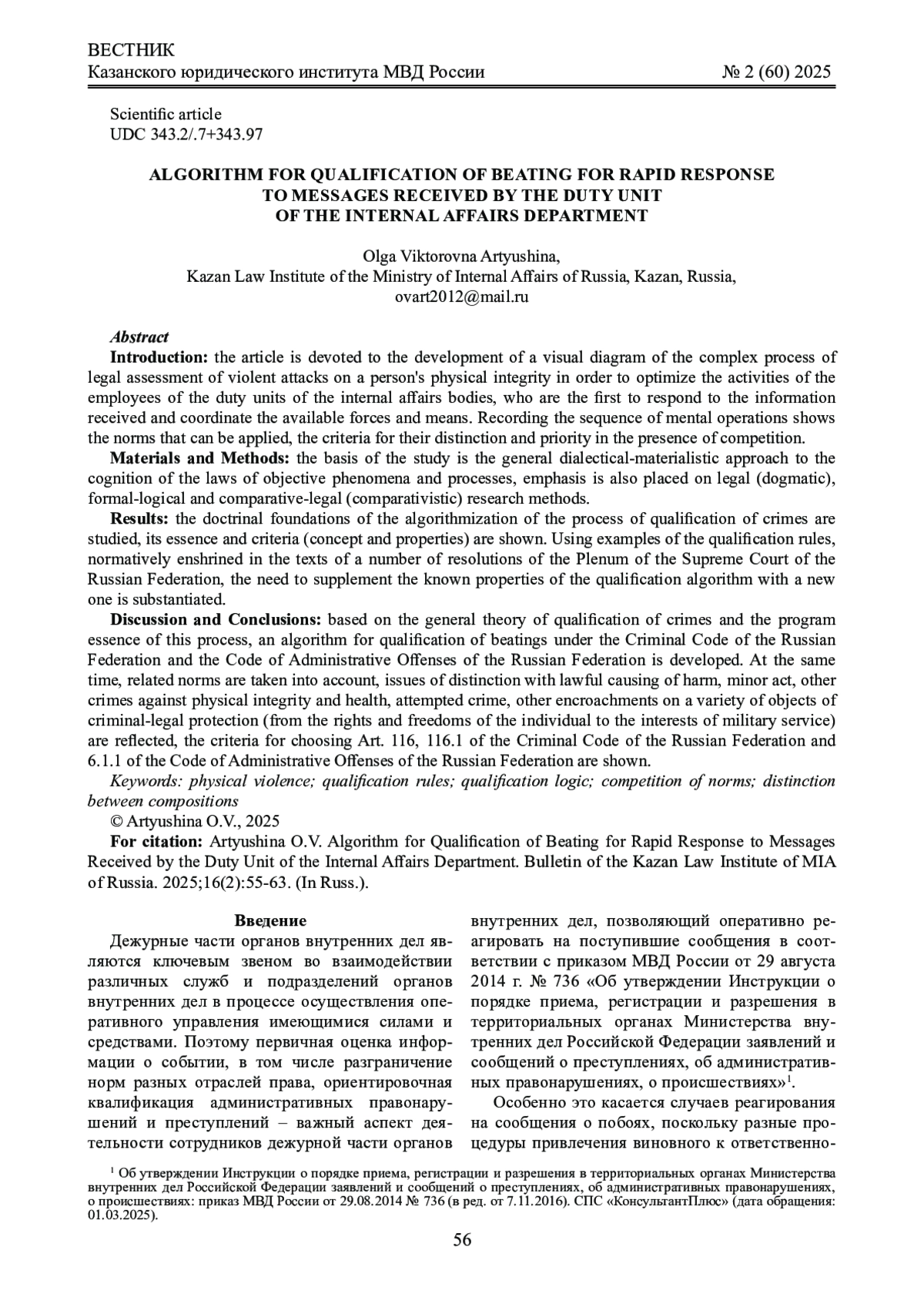 АРТЮШИНА О. В. АЛГОРИТМ КВАЛИФИКАЦИИ ПОБОЕВ ДЛЯ ОПЕРАТИВНОГО РЕАГИРОВАНИЯ НА СООБЩЕНИЯ, ПОСТУПАЮЩИЕ В ДЕЖУРНУЮ ЧАСТЬ ОРГАНОВ ВНУТРЕННИХ ДЕЛ // ВЕСТНИК КАЗАНСКОГО ЮРИДИЧЕСКОГО ИНСТИТУТА МВД РОССИИ. 2025. Т. 16 № 2 (60)