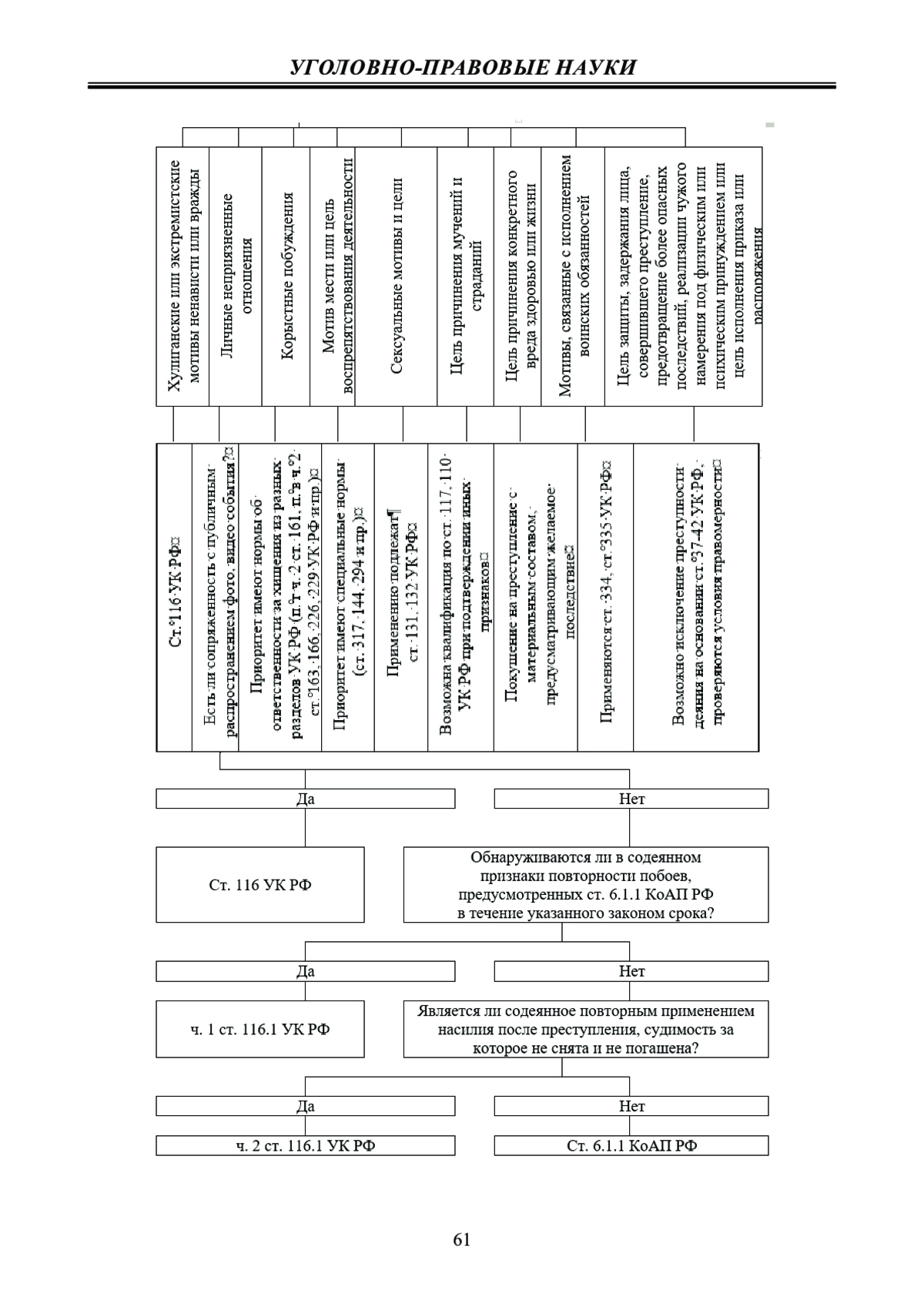 Обсуждение и заключение: на основе общей теории квалификации преступлений и программной сути данного процесса разработан алгоритм квалификации побоев по УК РФ и КоАП РФ. При этом учтены смежные нормы, отражены вопросы разграничения с правомерным причинением вреда, малозначительным деянием, иными преступлениями против телесной неприкосновенности и здоровья, покушением на преступление, иными посягательствами на самые разные объекты уголовно-правовой охраны (от прав и свобод личности до интересов воинской службы); показаны критерии выбора ст. 116, 116 1 УК РФ и 6.1.1 КоАП РФ.