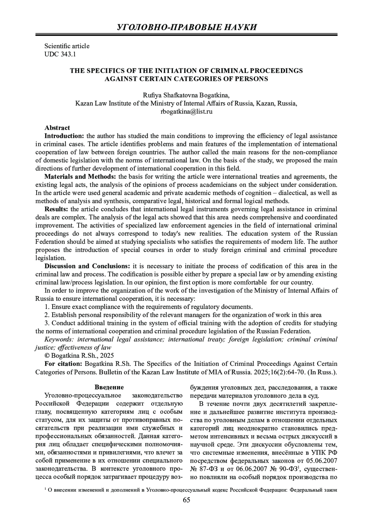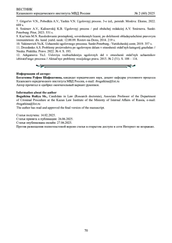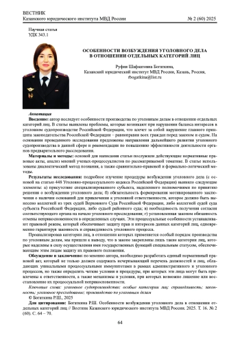 БОГАТКИНА Р. Ш. ОСОБЕННОСТИ ВОЗБУЖДЕНИЯ УГОЛОВНОГО ДЕЛА В ОТНОШЕНИИ ОТДЕЛЬНЫХ КАТЕГОРИЙ ЛИЦ // ВЕСТНИК КАЗАНСКОГО ЮРИДИЧЕСКОГО ИНСТИТУТА МВД РОССИИ. 2025. Т. 16 № 2 (60)