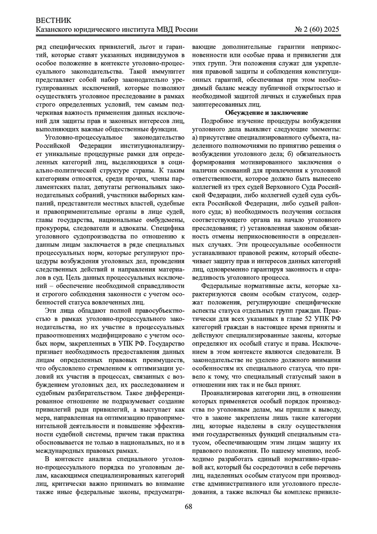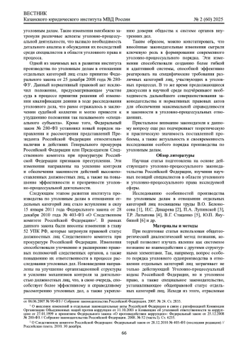 Статья: ОСОБЕННОСТИ ВОЗБУЖДЕНИЯ УГОЛОВНОГО ДЕЛА В ОТНОШЕНИИ ОТДЕЛЬНЫХ КАТЕГОРИЙ ЛИЦ (2025)