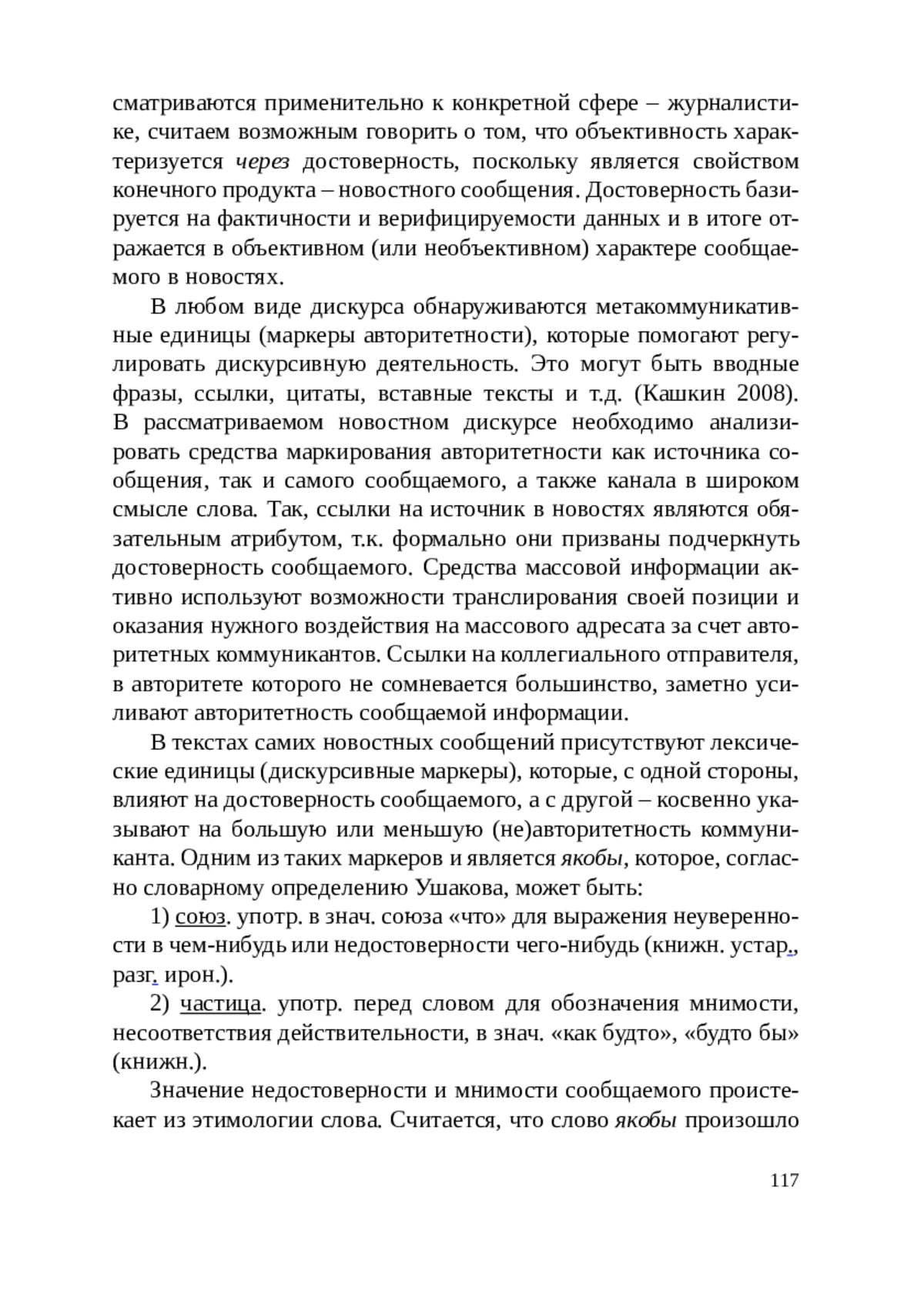 Данная статья посвящена одному из способов актуализации категории авторитетности, присутствующей в любом виде дискурса. Данная категория является основополагающей в новостном дискурсе, где коммуникация между условным отправителем и получателем происходит с учетом статусно-ролевых отношений, налагаемых данным типом институционального общения. В новостном дискурсе присутствуют маркеры, влияющие на авторитетность, одним из которых является дискурсивный маркер якобы. Отмечается его способность указывать как на степень достоверности информации, так и на авторитетность новостного сообщения. В анализе влияния дискурсивного маркера якобы на авторитетность новостей учитывается многоуровневый характер категории авторитетности.