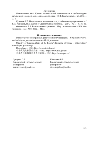 ШИПИЛОВА В.В., СУХАРЕВА О.В. ЛЕКСИЧЕСКИЕ МАРКЕРЫ КИТАЙСКОЙ НАЦИОНАЛЬНОЙ ИДЕНТИЧНОСТИ В ПОЛИТИЧЕСКОМ ДИСКУРСЕ КИТАЯ И РОССИИ // ЯЗЫК, КОММУНИКАЦИЯ И СОЦИАЛЬНАЯ СРЕДА. 2025. № 23