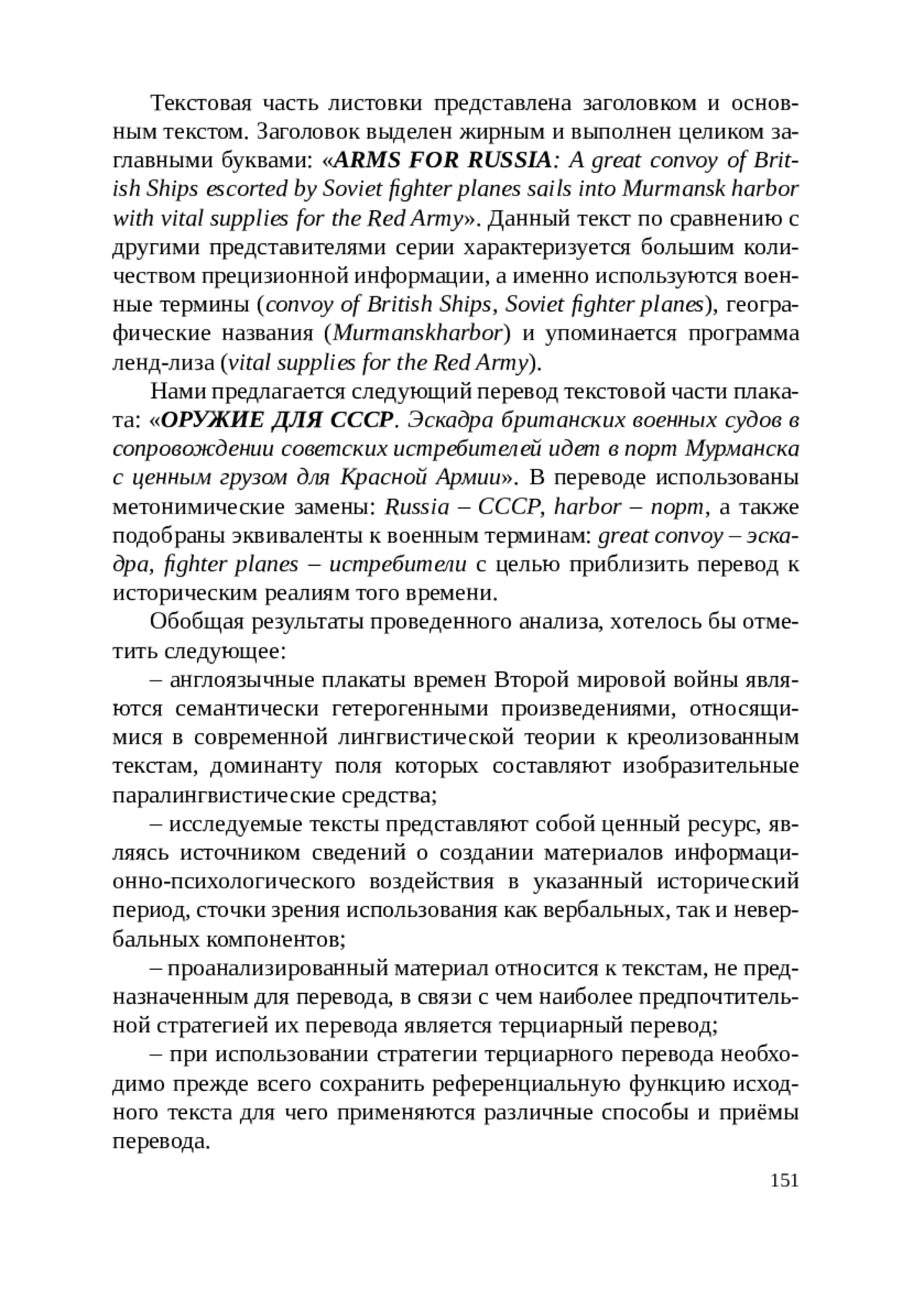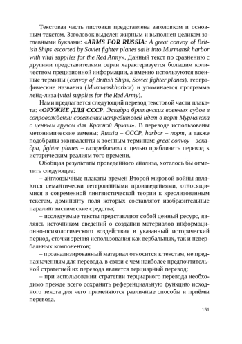 В статье исследуются англоязычные агитационные плакаты времён Второй мировой войны, которые рассматриваются в качестве креолизованного текста определенного типа. Анализируются как вербальный, так и невербальный компоненты указанных текстов. Определяются функции и тип данных текстов с точки зрения классификации текстов для перевода и предлагается наиболее оптимальная переводческая стратегия и способы перевода вербального компонента исследуемых текстов.