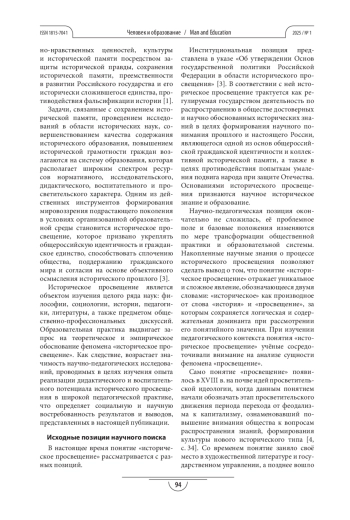 Статья посвящена изучению социально-педагогического феномена «историческое просвещение», анализу сложившейся практики реализации исторического просвещения в системе общего образования. Проведён терминологический анализ, позволивший проследить эволюцию значения и употребления понятия «историческое просвещение», уточнить его признаки и свойства. Предложено авторское определение исторического просвещения, раскрывающее его педагогическую сущность и смысловое значение. Историческое просвещение в России представлено как специально организованный педагогический процесс, направленный на создание условий для повышения уровня исторической памяти и сохранения традиционных духовно-нравственных и культурно-исторических ценностей. Представлены результаты предпринятого исследования с целью изучения актуального состояния региональной практики реализации исторического просвещения исторической грамотности личности, которая рассматривается как основа для формирования общероссийской гражданской идентичности, коллективной в общеобразовательных организациях. Достоверность полученных результатов подтверждена избранной методологией исследования, выстроенной на основе применения системного, деятельностного и социокультурного подходов. Предложены рекомендации по организации педагогической деятельности в области исторического просвещения обучающихся общеобразовательной школы.