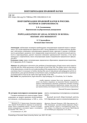 Публикация посвящена проблематике популяризации правовой науки и приурочена к 105-летию юридического факультета ВГУ. Автор обращается к истории явления, раскрывает собственное понимание популяризации правовой науки, приходит к выводу о необходимости дальнейшего развития этого направления педагогической и просветительской деятельности в юриспруденции, уделяет отдельное внимание краеведческой тематике, в том числе прошлому и современному опыту популяризации права сотрудниками юридического факультета ВГУ.