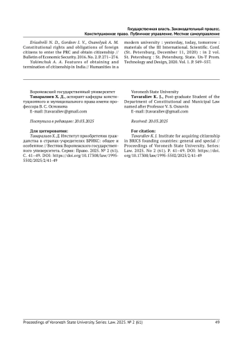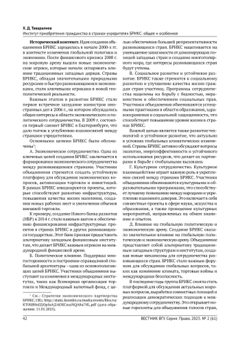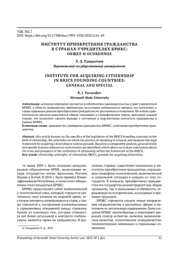 ТАВАРАЛИЕВ Х.Д. ИНСТИТУТ ПРИОБРЕТЕНИЯ ГРАЖДАНСТВА В СТРАНАХ-УЧРЕДИТЕЛЯХ БРИКС: ОБЩЕЕ И ОСОБЕННОЕ // ВЕСТНИК ВОРОНЕЖСКОГО ГОСУДАРСТВЕННОГО УНИВЕРСИТЕТА. СЕРИЯ: ПРАВО. 2025. № 2 (61)