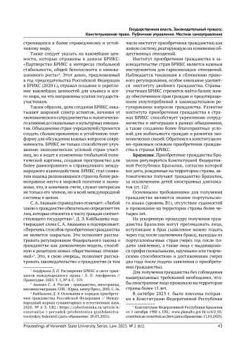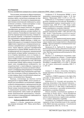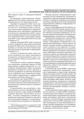 Статья: ИНСТИТУТ ПРИОБРЕТЕНИЯ ГРАЖДАНСТВА В СТРАНАХ-УЧРЕДИТЕЛЯХ БРИКС: ОБЩЕЕ И ОСОБЕННОЕ (2025)