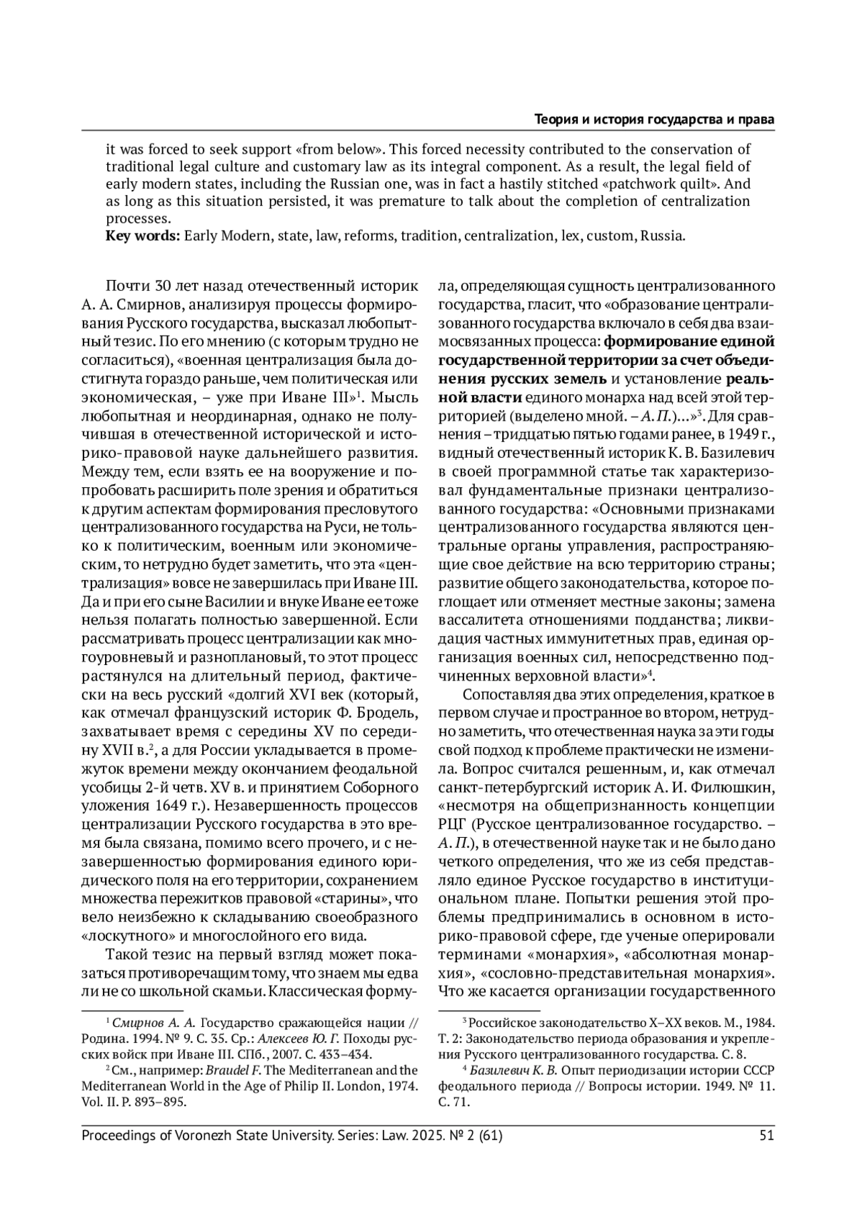 В исторической традиции устоялось наименование образовавшегося во 2-й половине XV в. Русского государства «централизованным». Вместе с тем четкого и недвусмысленного определения сущности этого термина в отечественной исторической литературе нет, а имеющиеся определения носят расплывчатый и туманный характер. Эта неопределенность связана с тем, что сама по себе «централизованность» представляет собой сложный и многоплановый политико-правовой феномен, и процессы централизации власти на разных уровнях протекали с разной скоростью. Раннемодерные государства по этой причине являлись недоцентрализованными. Автор статьи доказывает этот тезис на примере «двоеначалия» русского права в эпоху «долгого XVI в.» (середина XV - середина XVII в.). В это время коронное право сосуществовало с обычным правом. При этом обычное право по своей значимости не уступало праву коронному. Это было связано с институциональной слабостью раннемодерного государства. Не обладая развитой «мускулатурой» власти, оно было вынуждено искать поддержки «снизу». Эта вынужденная необходимость способствовала консервации традиционной правовой культуры и обычного права как ее неотъемлемого компонента. В результате правовое поле раннемодерных государств, в том числе и Русского, на деле представляло собой сшитое на скорую руку «лоскутное одеяло». И до тех пор, пока такое положение сохранялось, говорить о завершенности процессов централизации преждевременно.