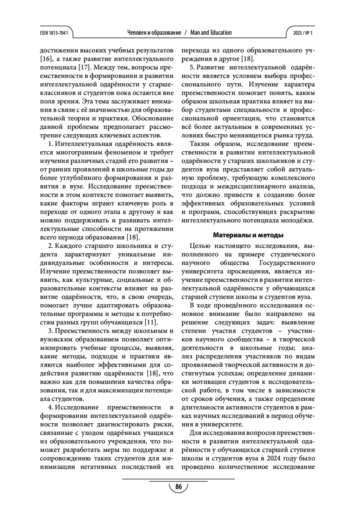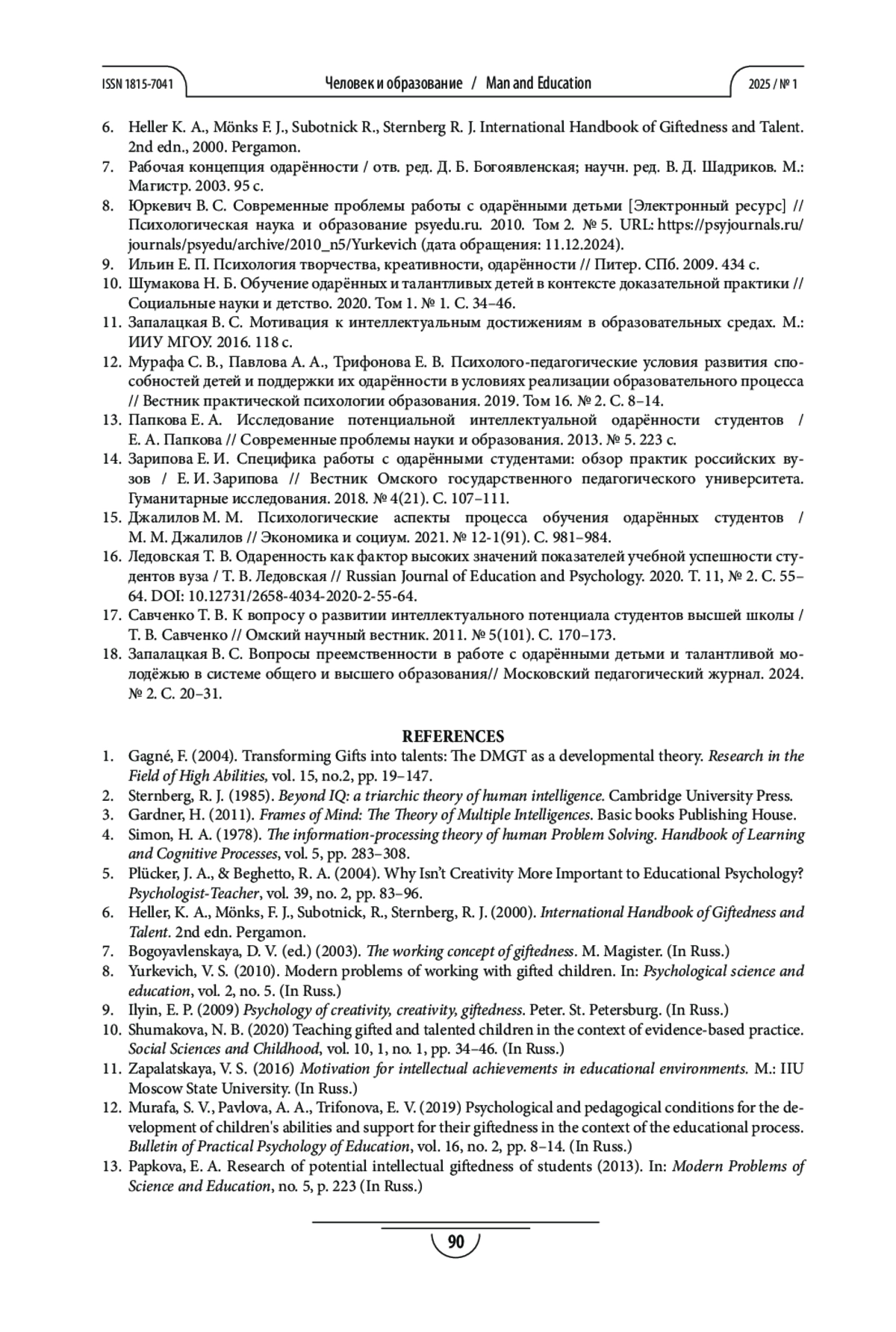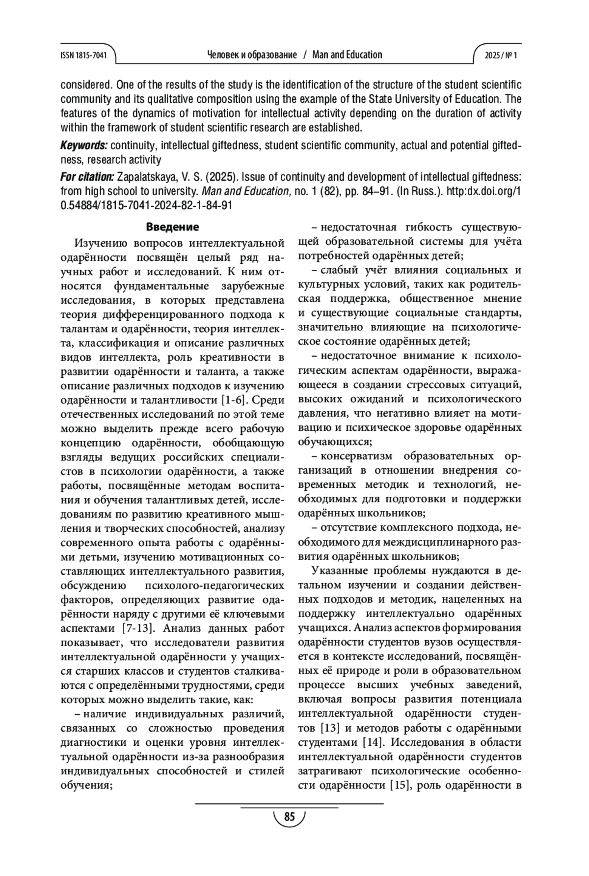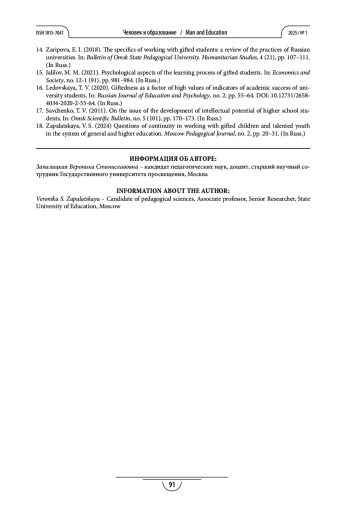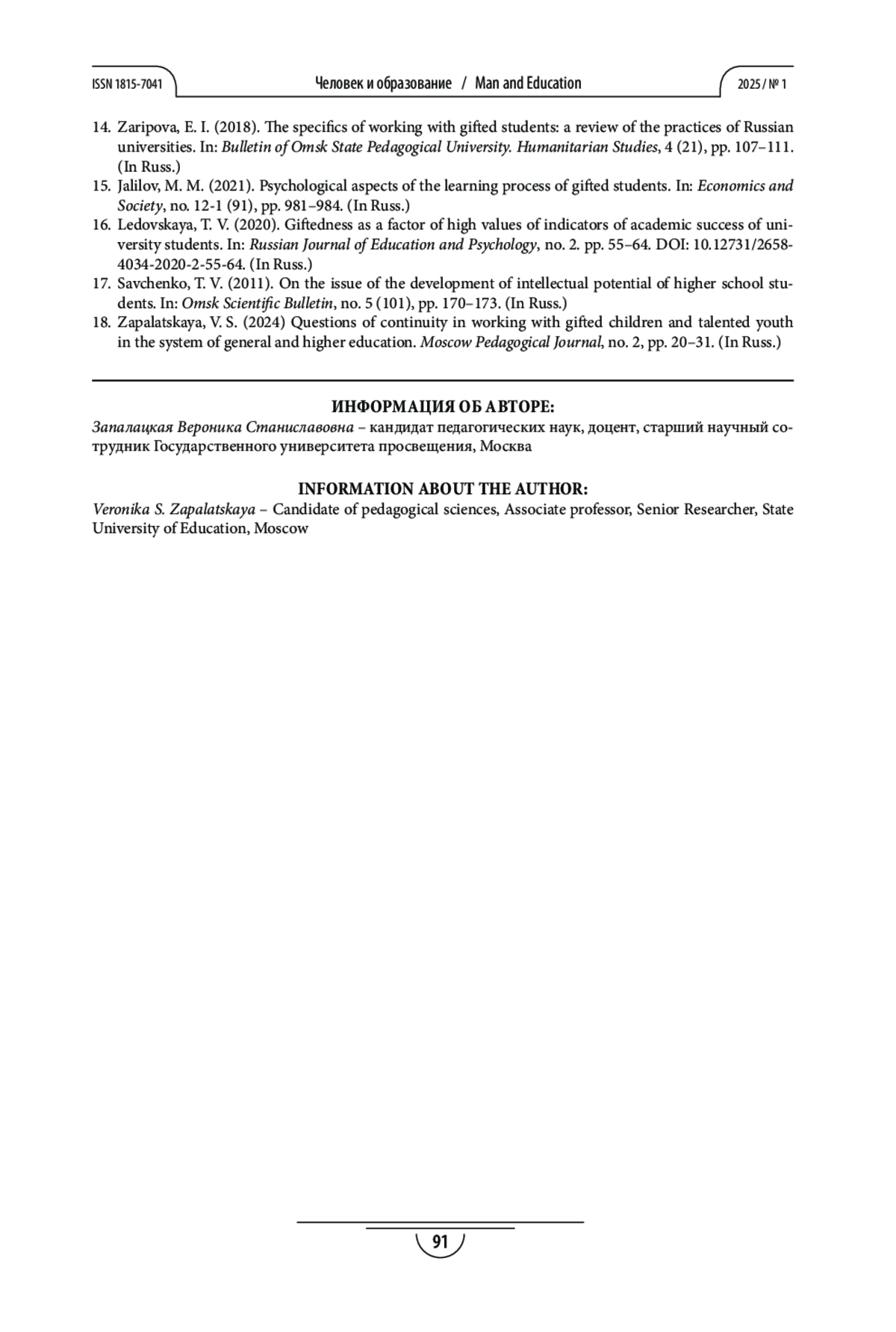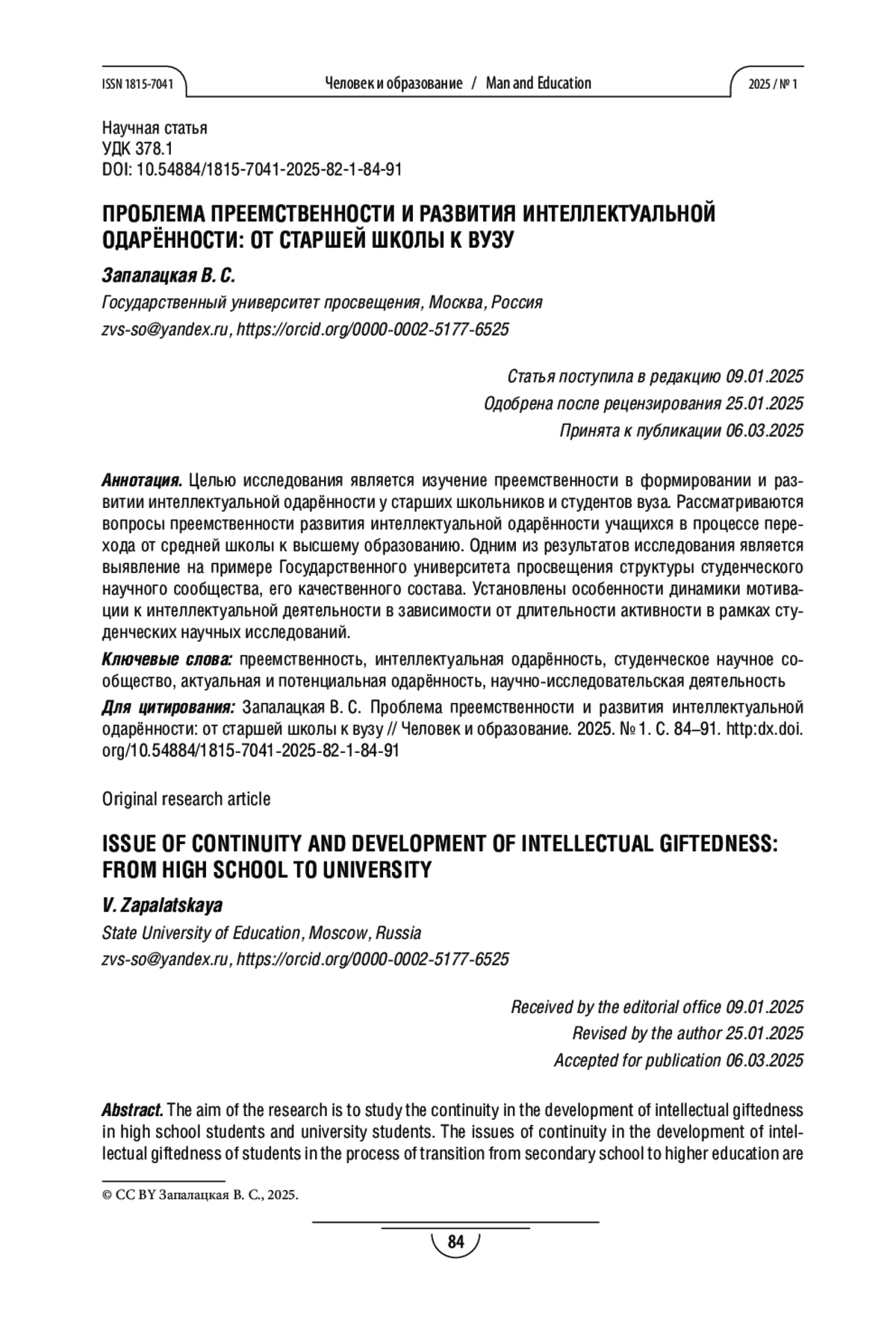 ЗАПАЛАЦКАЯ В. С. ПРОБЛЕМА ПРЕЕМСТВЕННОСТИ И РАЗВИТИЯ ИНТЕЛЛЕКТУАЛЬНОЙ ОДАРЁННОСТИ: ОТ СТАРШЕЙ ШКОЛЫ К ВУЗУ // ЧЕЛОВЕК И ОБРАЗОВАНИЕ. 2025. № 1 (82)