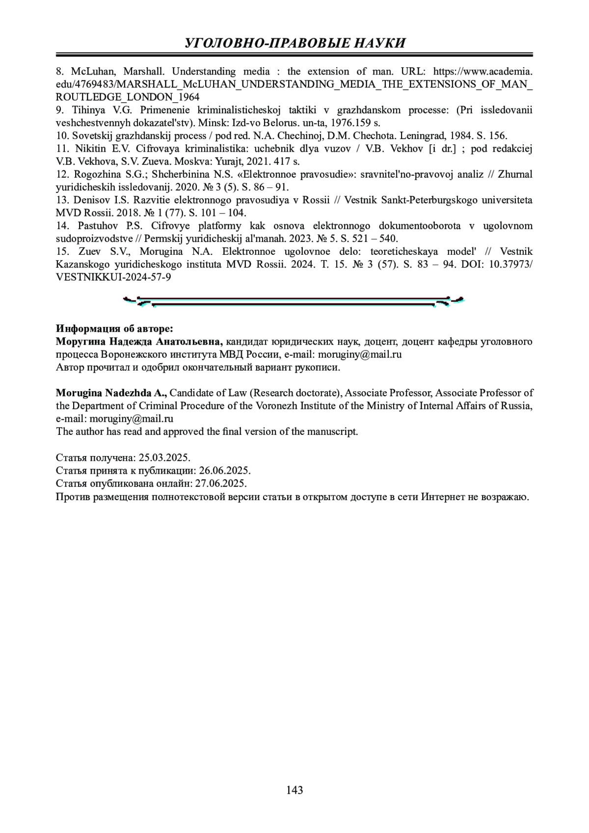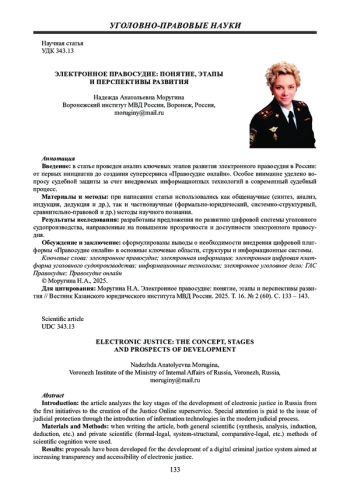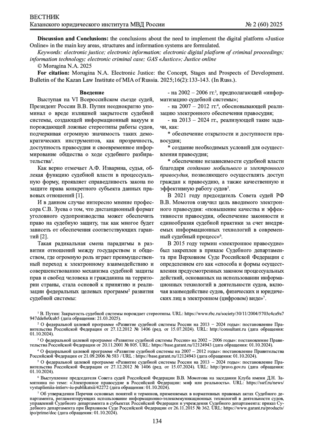 МОРУГИНА Н. А. ЭЛЕКТРОННОЕ ПРАВОСУДИЕ: ПОНЯТИЕ, ЭТАПЫ И ПЕРСПЕКТИВЫ РАЗВИТИЯ // ВЕСТНИК КАЗАНСКОГО ЮРИДИЧЕСКОГО ИНСТИТУТА МВД РОССИИ. 2025. Т. 16 № 2 (60)