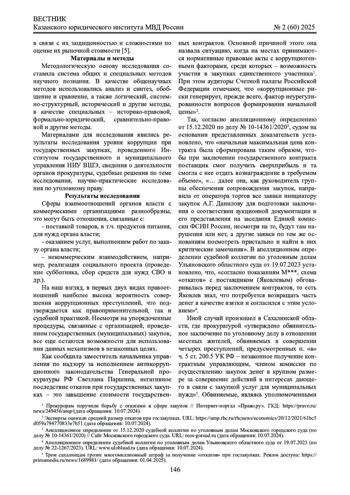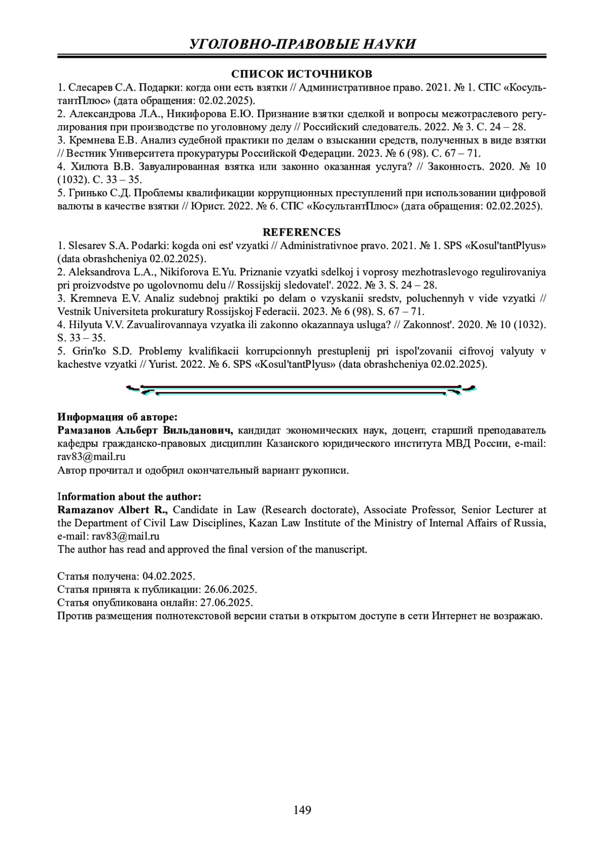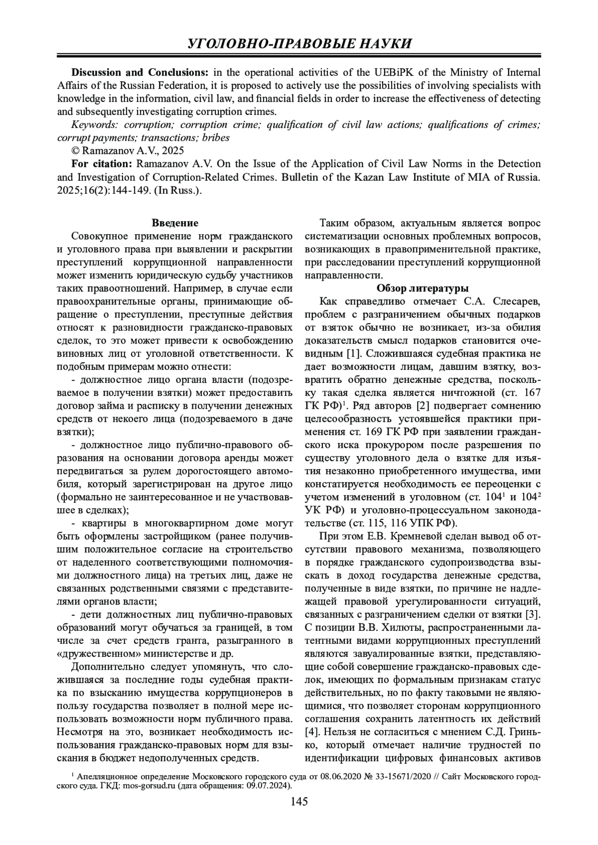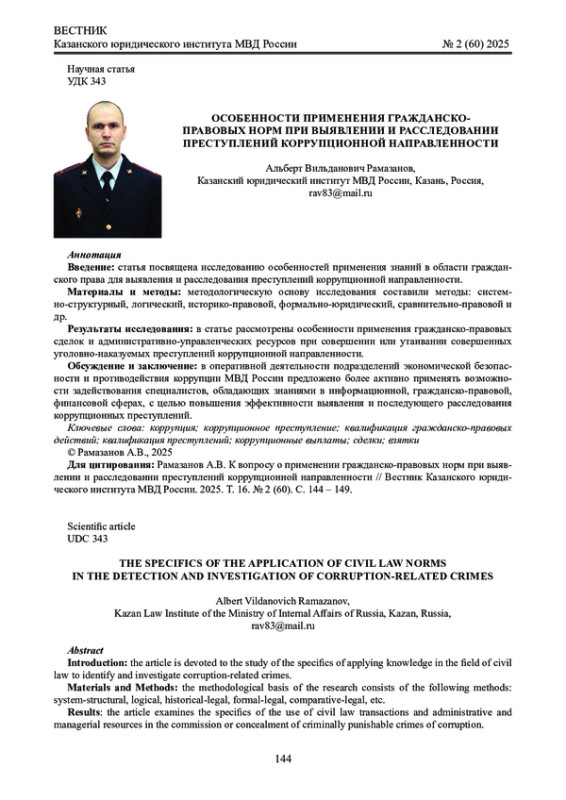 РАМАЗАНОВ А. В. ОСОБЕННОСТИ ПРИМЕНЕНИЯ ГРАЖДАНСКО-ПРАВОВЫХ НОРМ ПРИ ВЫЯВЛЕНИИ И РАССЛЕДОВАНИИ ПРЕСТУПЛЕНИЙ КОРРУПЦИОННОЙ НАПРАВЛЕННОСТИ // ВЕСТНИК КАЗАНСКОГО ЮРИДИЧЕСКОГО ИНСТИТУТА МВД РОССИИ. 2025. Т. 16 № 2 (60)