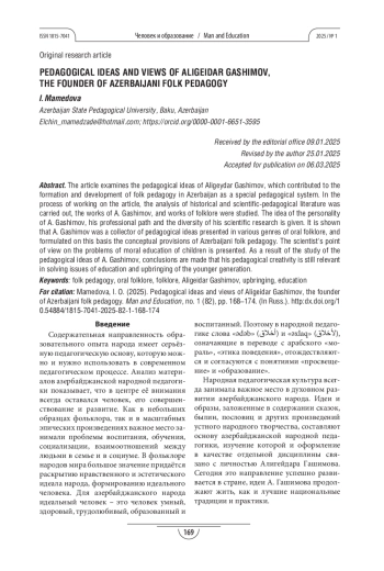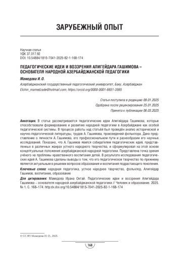 МАМЕДОВА И. О. ПЕДАГОГИЧЕСКИЕ ИДЕИ И ВОЗЗРЕНИЯ АЛИГЕЙДАРА ГАШИМОВА – ОСНОВАТЕЛЯ НАРОДНОЙ АЗЕРБАЙДЖАНСКОЙ ПЕДАГОГИКИ // ЧЕЛОВЕК И ОБРАЗОВАНИЕ. 2025. № 1 (82)
