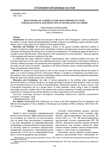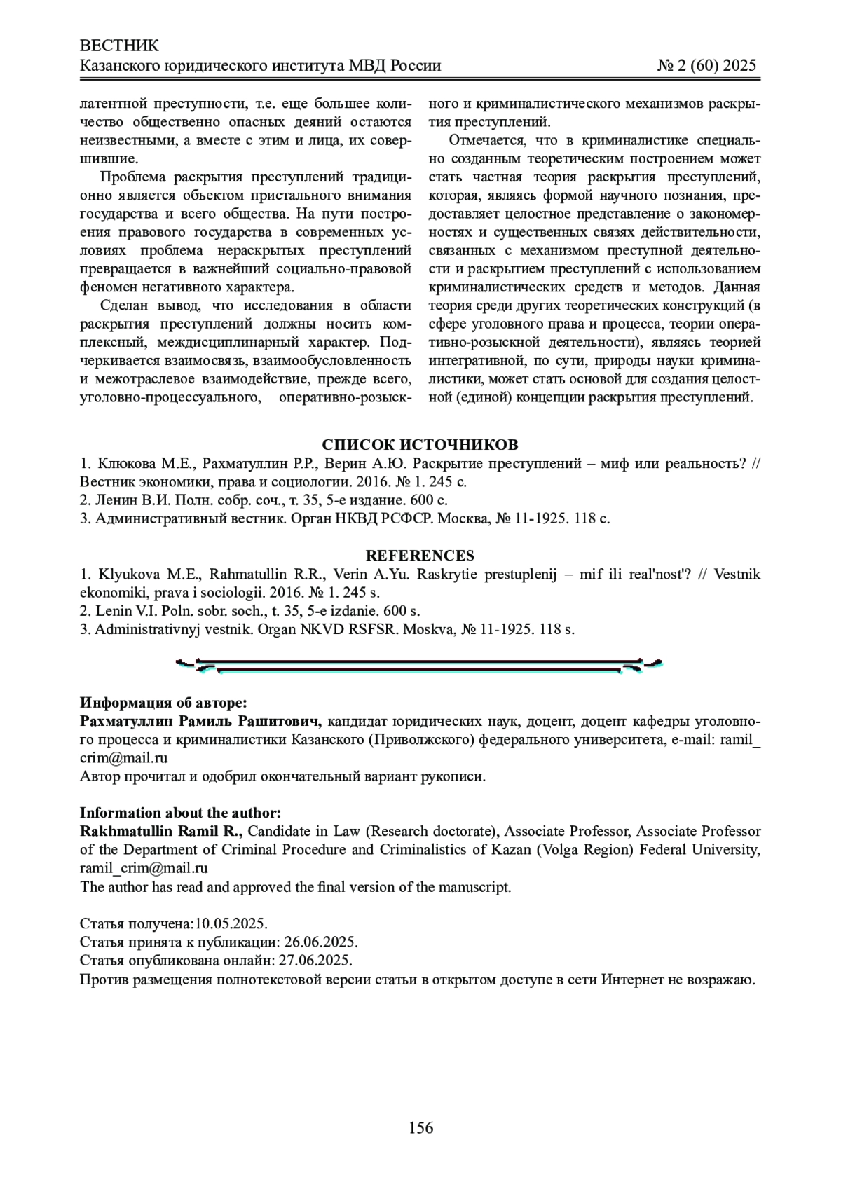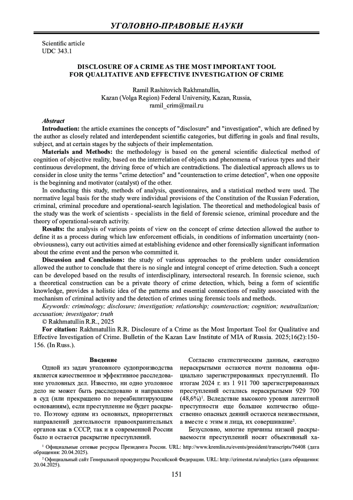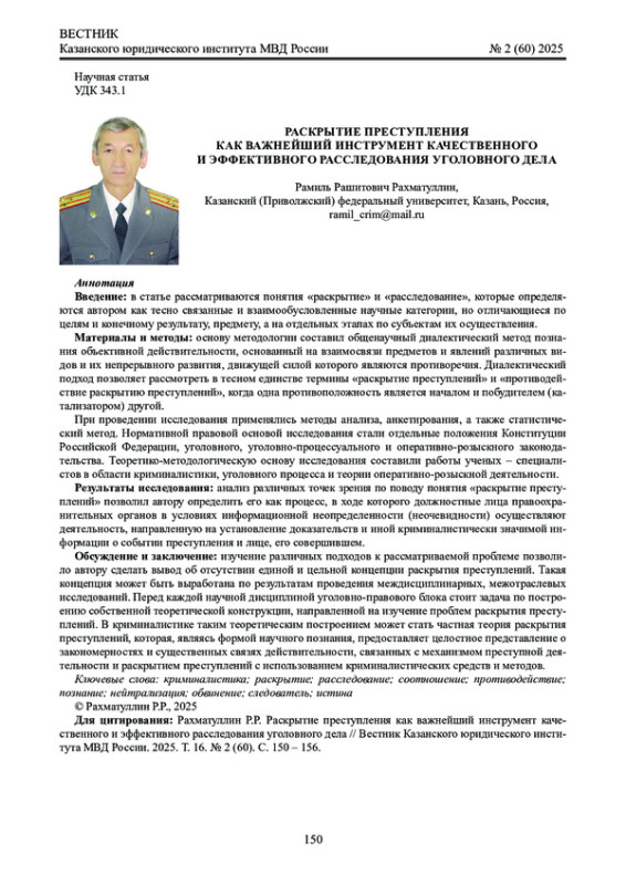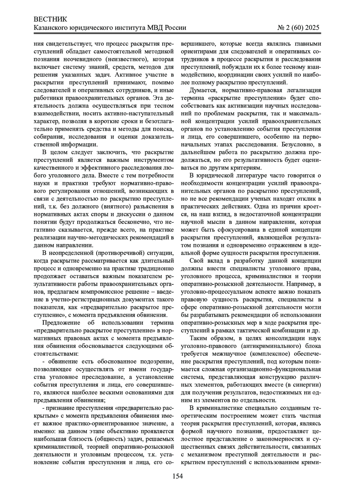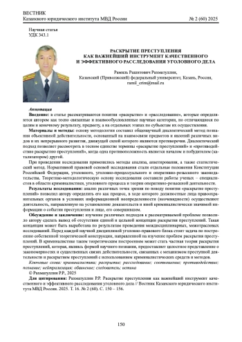 РАХМАТУЛЛИН Р. Р. РАСКРЫТИЕ ПРЕСТУПЛЕНИЯ КАК ВАЖНЕЙШИЙ ИНСТРУМЕНТ КАЧЕСТВЕННОГО И ЭФФЕКТИВНОГО РАССЛЕДОВАНИЯ УГОЛОВНОГО ДЕЛА // ВЕСТНИК КАЗАНСКОГО ЮРИДИЧЕСКОГО ИНСТИТУТА МВД РОССИИ. 2025. Т. 16 № 2 (60)