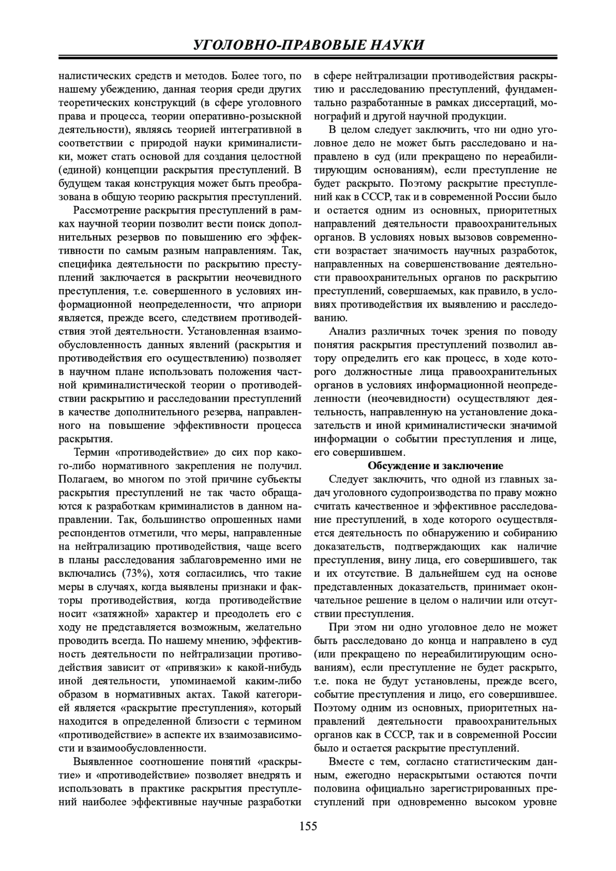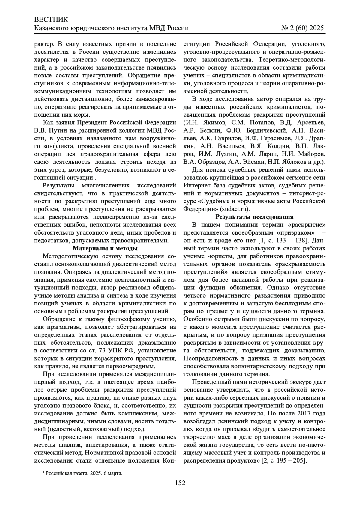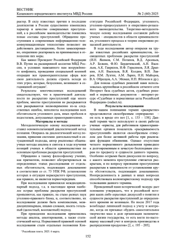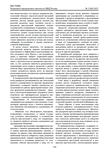 Статья: РАСКРЫТИЕ ПРЕСТУПЛЕНИЯ КАК ВАЖНЕЙШИЙ ИНСТРУМЕНТ КАЧЕСТВЕННОГО И ЭФФЕКТИВНОГО РАССЛЕДОВАНИЯ УГОЛОВНОГО ДЕЛА (2025)