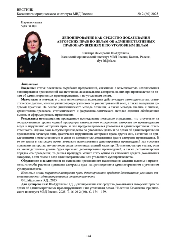 Результаты исследования: проведенное исследование позволило определить, что отсутствие на государственном уровне единой процедуры изначального определения авторства по произведениям ведет к нарушению авторских прав, за что предусматривается уголовная и административная ответственность. Однако даже в случае производства по уголовным делам и по делам об административном производстве зачастую лица, фактически нарушившие авторские права других лиц, остаются не привлеченными к ответственности в связи со сложностью доказывания факта авторства произведения. В то же время в настоящее время возможно использование депонирования произведений как средства признания авторства, но оно носит лишь рекомендательный характер. По мнению автора статьи, если на законодательном уровне будет признано депонирование произведений, а также регламентирован порядок его проведения, то данная процедура может стать одним из ключевых средств доказывания авторства, в том числе в ходе административного или уголовного судопроизводства.