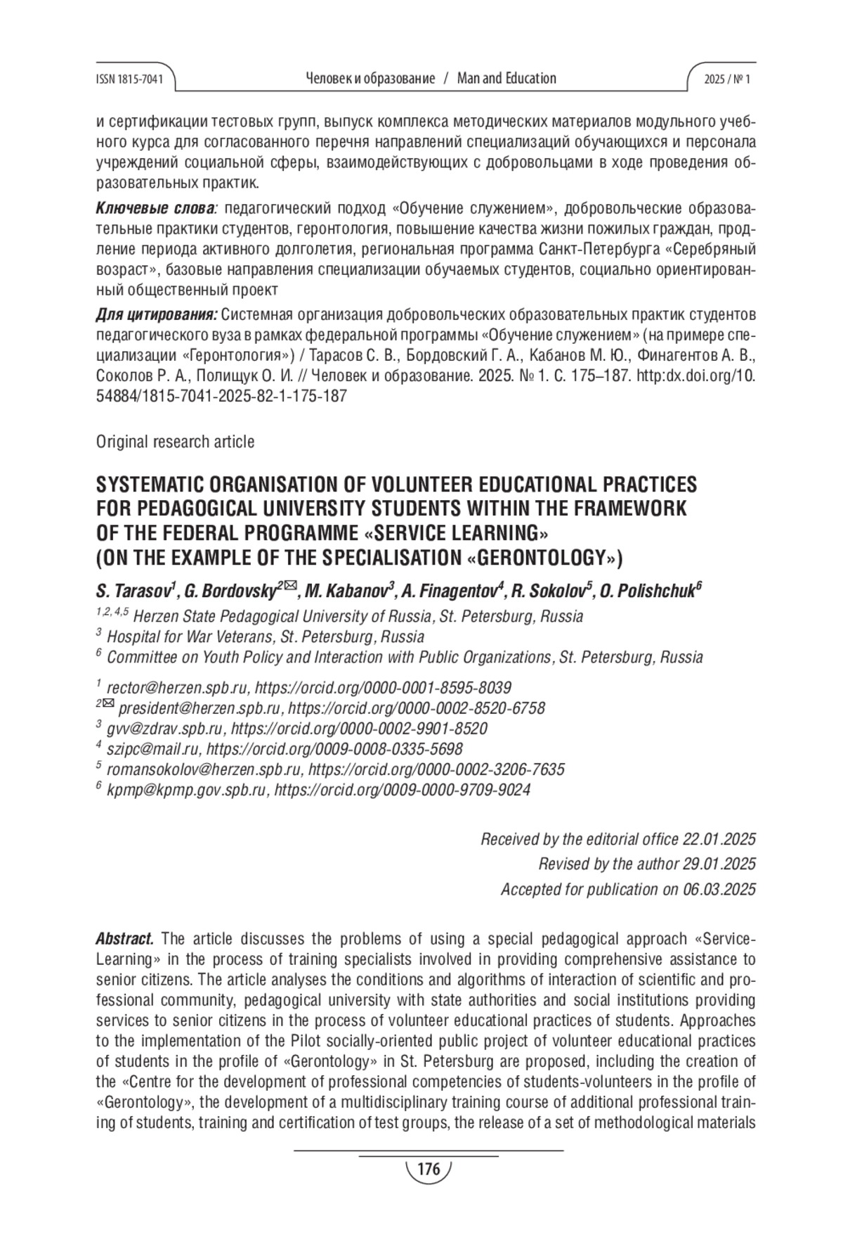 19. Тарасов С. В., Бордовский Г. А., Финагентов А. В. Создание института развития информационных и образовательных технологий в области геронтологии в структуре РГПУ им. А. И. Герцена и формирование системы комплексной медико-социальной помощи гражданам старшего поколения в Санкт-Петербурге // Успехи геронтологии. 2023. Т. 36. № 3. С. 435-436.