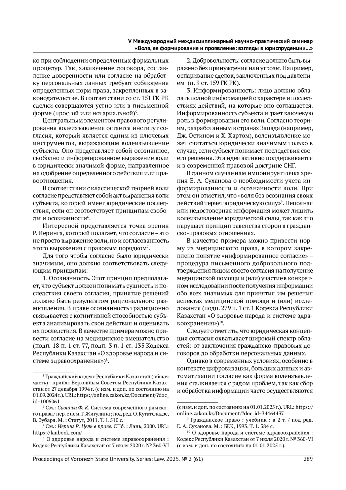 Рассматривается особенность согласия как юридической формы волеизъявления в контексте работы с большими данными; проанализирована проблема соответствия традиционного подхода к трактовке согласия современным вызовам цифровой трансформации. В условиях массового сбора и обработки персональных данных технологии больших данных и алгоритмы искусственного интеллекта ставят под сомнение информированность, свободу и осознанность волеизъявления субъектов данных. Особое внимание уделено вопросам многоцелевого использования данных, сложности восприятия пользовательских соглашений и ограничению автономии личности из-за автоматизированного принятия решений. Анализируются национальное и международное законодательство, включая положения GDPR и Закона Республики Казахстан «О персональных данных и их защите», а также практические и теоретические проблемы обеспечения прав субъектов данных. Сделан вывод о необходимости разработки новых подходов к правовому регулированию согласия, обеспечивающих реальное сохранение свободы и автономии воли в условиях цифровой трансформации.