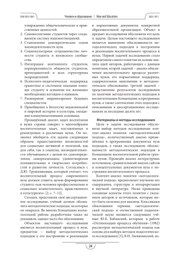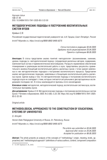 В статье представлен анализ понятий «методология» (возникновение, значение, уровни, подходы) и «методологический подход» (определения различных авторов, содержание, компонентный состав и терминологическое многообразие). Раскрыто нормативное обеспечение планирования и реализации воспитательной работы в вузе, представлены результаты сравнительного анализа Концепций воспитательной работы различных вузов с точки зрения заявленных в них методологических подходов к построению воспитательного процесса. Представлен анализ методологических подходов, заявляемых в Концепциях воспитательной работы различных вузов. Сделан вывод о том, что методологические подходы к построению воспитательного подхода в вузе не совпадают с теми, которые считаются актуальными в диссертационных исследованиях последних лет. В статье анализируются причины этого несовпадения.