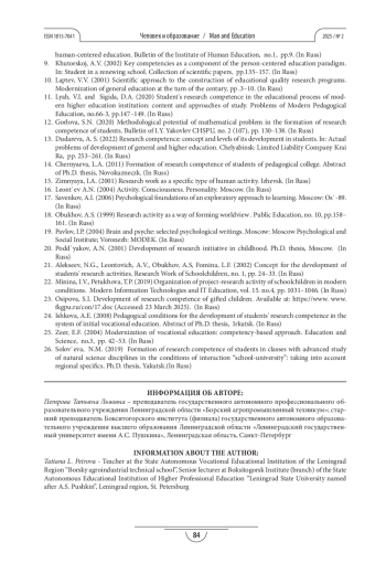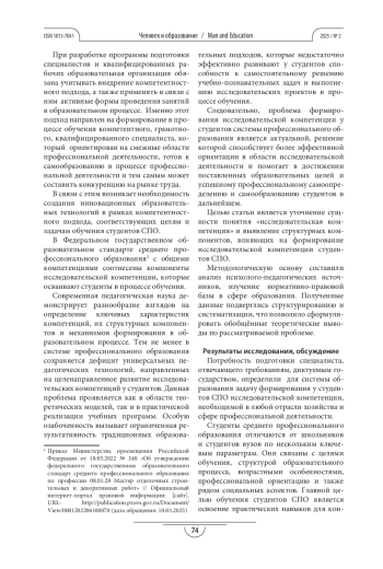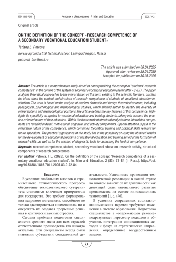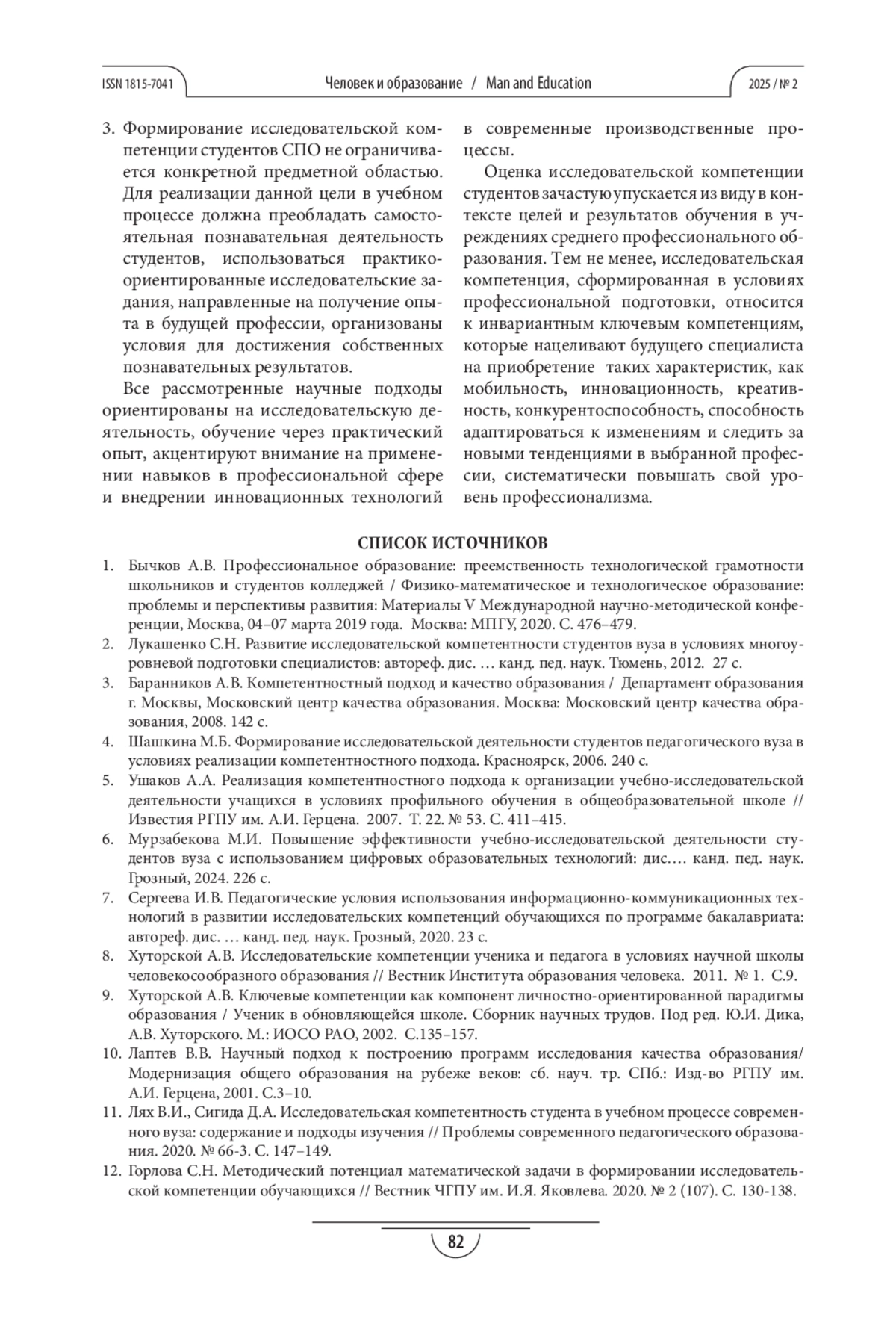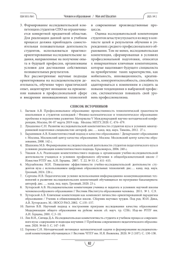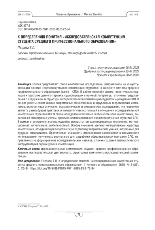 ПЕТРОВА Т. Л. К ОПРЕДЕЛЕНИЮ ПОНЯТИЯ «ИССЛЕДОВАТЕЛЬСКАЯ КОМПЕТЕНЦИЯ СТУДЕНТА СРЕДНЕГО ПРОФЕССИОНАЛЬНОГО ОБРАЗОВАНИЯ» // ЧЕЛОВЕК И ОБРАЗОВАНИЕ. 2025. № 2 (83)