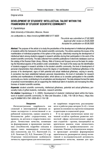 В статье представлены результаты исследования, целью которого является изучение особенностей развития интеллектуальной одарённости студентов в рамках деятельности студенческого научного сообщества. Рассматриваются вопросы проявления отдельных свойств психики, совокупно обеспечивающих развитие интеллектуальной одарённости у студентов, занимающихся научно-исследовательской деятельностью в период их участия в работе студенческого научного сообщества. Данные, собранные из научных публикаций в электронных базах (Российская государственная библиотека, eLibrary, Web of Science и Scopus), служат основой для анализа теоретических аспектов рассматриваемой проблемы. Результатом исследования стало выявление у студентов, занимающихся научно-исследовательской деятельностью в студенческом научном сообществе, уровня развития личностных характеристик, совокупно обеспечивающих степень проявления интеллектуальной одарённости в процессе её развития, признаков наличия как потенциальной, так и актуальной интеллектуальной одарённости, различающихся по степени выраженности. Установлена связь между личностными характеристиками, уровнем мотивации к научно-исследовательской деятельности и проявлениями интеллектуальной одарённости, что позволяет рассматривать участие в научном сообществе как фактор, способствующий её актуализации и развитию. Полученные данные легли в основу практических рекомендаций, направленных на поддержку интеллектуальной одарённости студентов и повышение эффективности деятельности студенческих научных обществ.