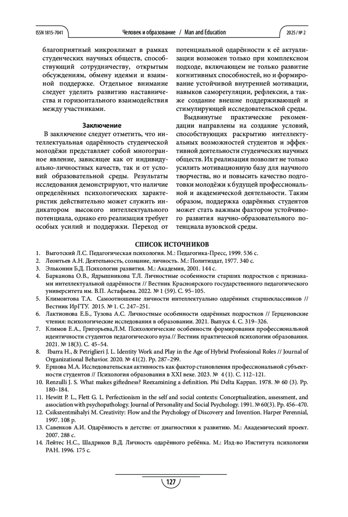 7. Климов Е.А., Григорьева,Л.М. Психологические особенности формирования профессиональной идентичности студентов педагогического вуза // Вестник практической психологии образования. 2021. № 18(3). С. 45-54.