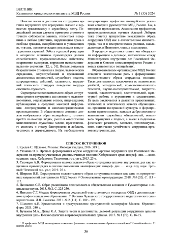 2. Ушакова О.В. Процесс формирования образа сотрудника органов внутренних дел Российской Федерации: на примере участковых уполномоченных полиции Хабаровского края: автореф. дис. … канд. социолог. наук. Хабаровск: Тихоокеан. гос. ун-т, 2015. 23 с.