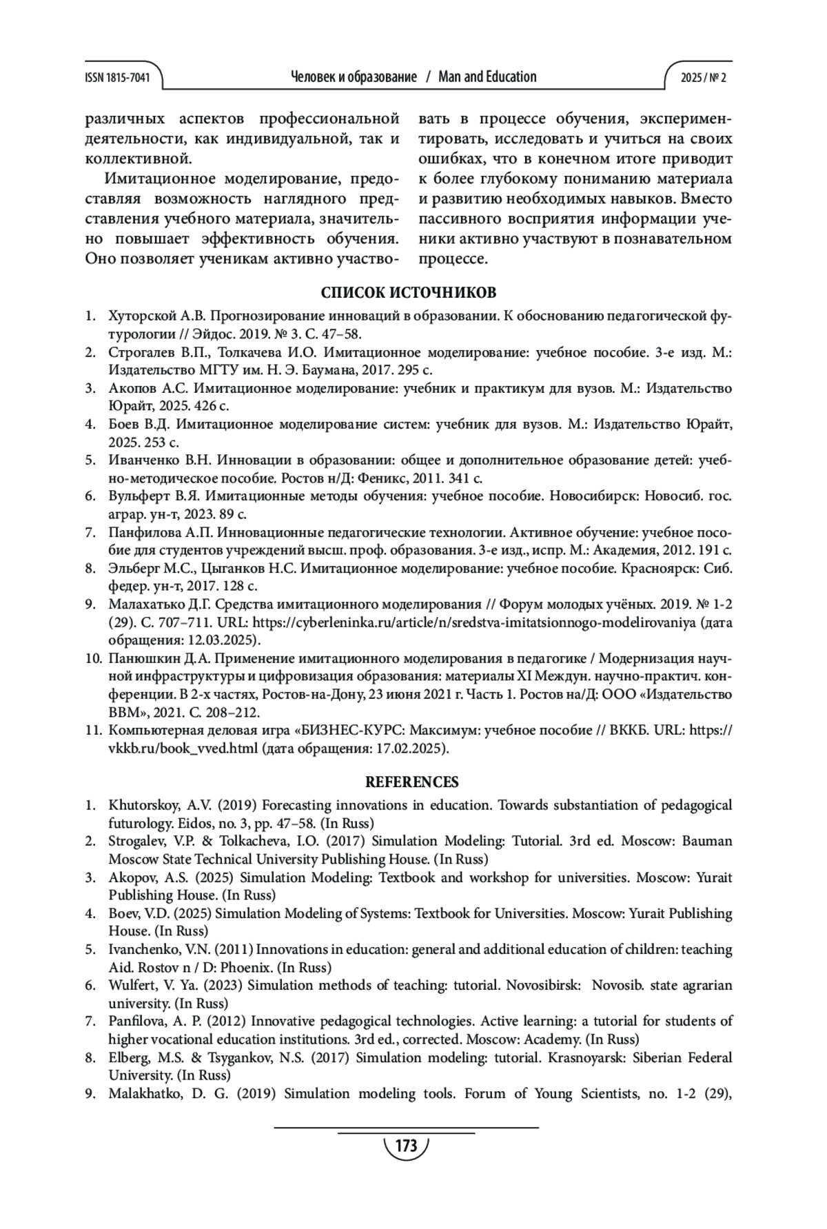 6. Вульферт В.Я. Имитационные методы обучения: учебное пособие. Новосибирск: Новосиб. гос. аграр. ун-т, 2023. 89 с.