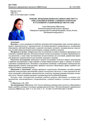 Статья: ГЕНЕЗИС ПРОБЛЕМЫ МЕЖОТРАСЛЕВОГО ИНСТИТУТА ОБЖАЛОВАНИЯ В ФОРМЕ СУДЕБНОГО КОНТРОЛЯ В УГОЛОВНОМ СУДОПРОИЗВОДСТВЕ РОССИИ (2024)