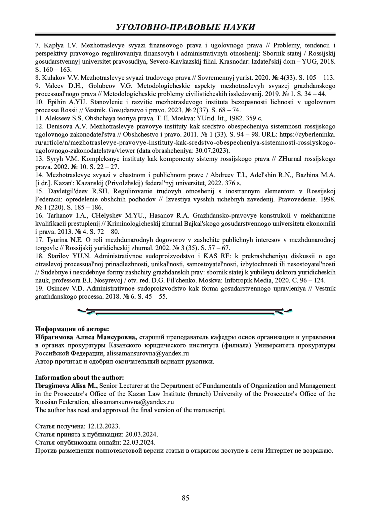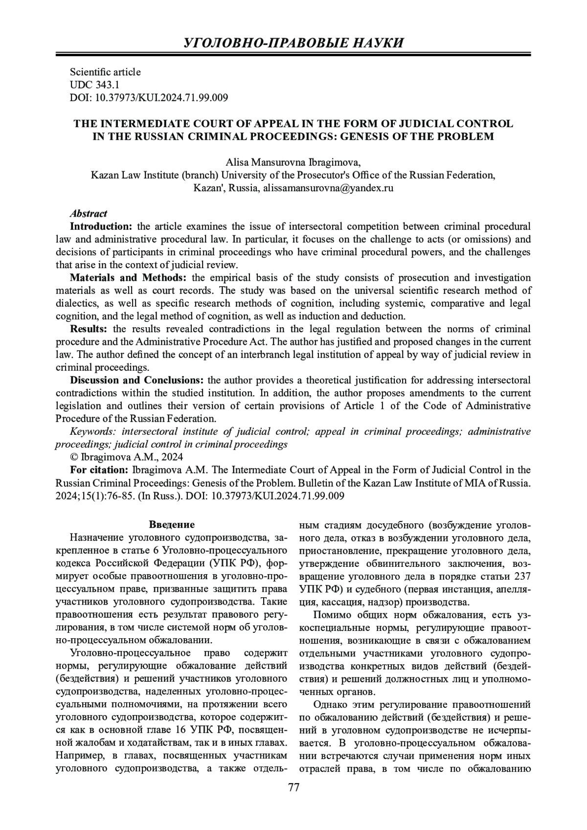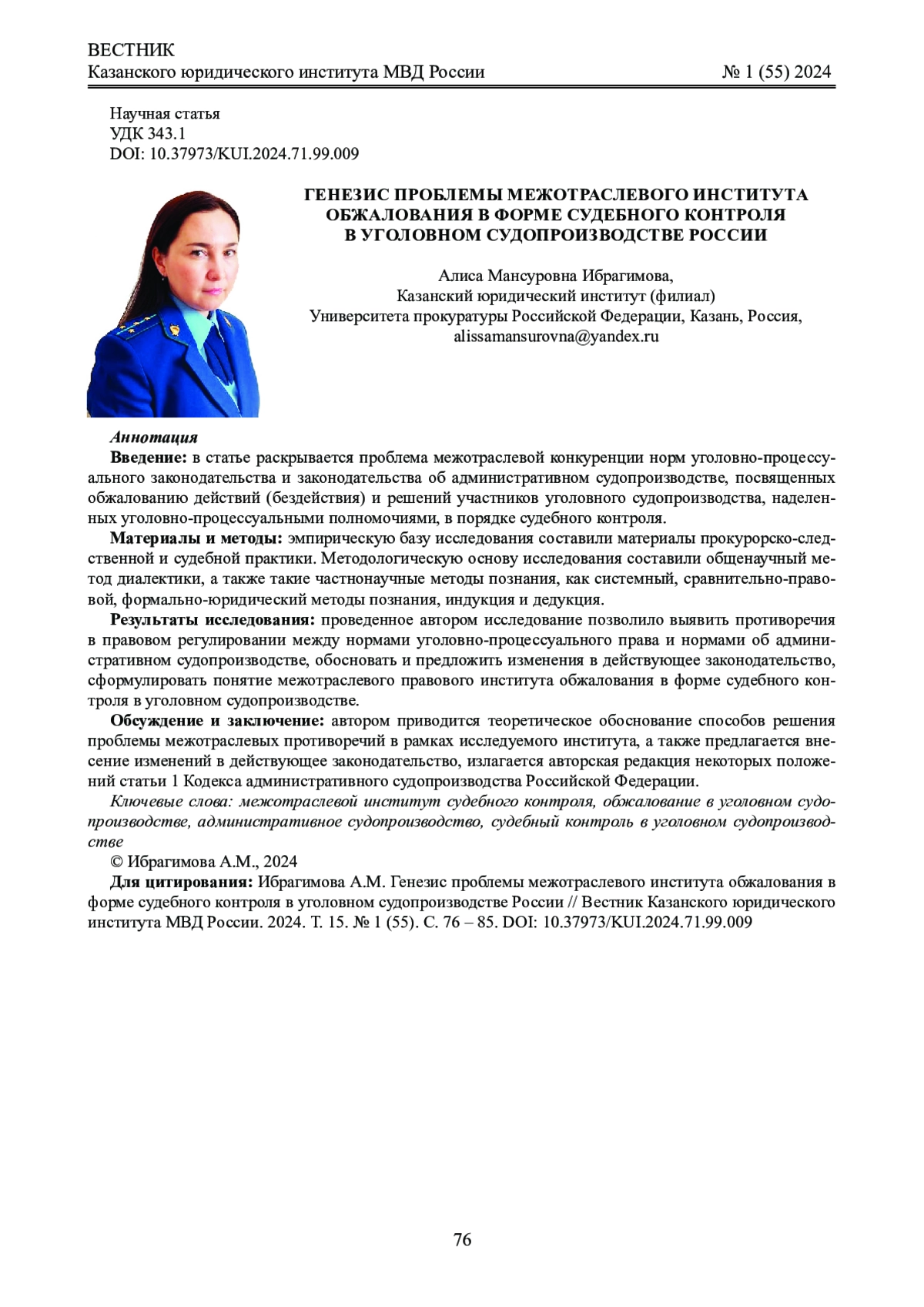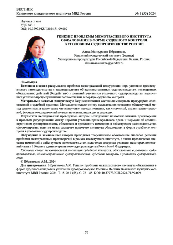 ИБРАГИМОВА А. М. ГЕНЕЗИС ПРОБЛЕМЫ МЕЖОТРАСЛЕВОГО ИНСТИТУТА ОБЖАЛОВАНИЯ В ФОРМЕ СУДЕБНОГО КОНТРОЛЯ В УГОЛОВНОМ СУДОПРОИЗВОДСТВЕ РОССИИ // ВЕСТНИК КАЗАНСКОГО ЮРИДИЧЕСКОГО ИНСТИТУТА МВД РОССИИ. 2024. Т. 15 № 1 (55)