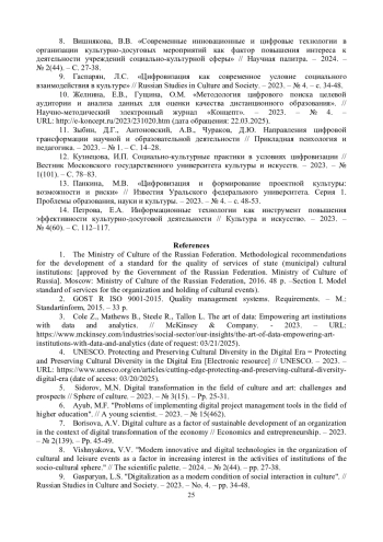 5. Сидоров, М.Н. Цифровая трансформация в сфере культуры и искусства: вызовы и перспективы // Сфера культуры. - 2023. - № 3(15). - С. 25-31.