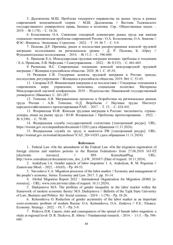 13. Флоринская Ю.Ф. Женская трудовая миграция в Россию: численность, страны-доноры, ниши на рынке труда / Ю.Ф. Флоринская // Проблемы прогнозирования. - 2022. - № 1(190). - С. 78-90.
