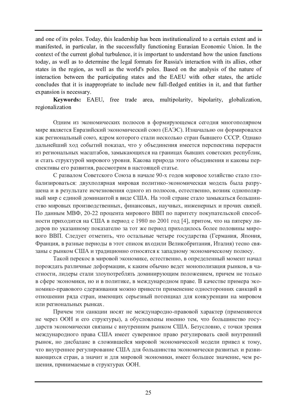 Современный мир, поглащенный идей глобализации, доминировавшей после окончания холодной войны, переходит в новую фазу, характеризующуюся регионализацией. Так можно назвать процесс формирования современной многополярности, качественно отличающейся от биполярности времен холодной войны. Безусловно, Россия относится к одному из лидеров Евразийского региона и одним из его полюсов. Это лидерство на сегодняшний день в определенной степени институционализировано и проявляется, в частности, в успешно функционирующем Евразийском экономическом союзе. В условиях существующей мировой турбулентности важно понять, как функционирует союз сегодня, а также определить правовые форматы взаимодействия России с союзниками, иными государствами региона, а также мировыми полюсами. В статье на основе анализа характера взаимодействия между государствами-созниками и ЕАЭС с иными государствами сделан вывод о нецелесообразности включения в него новых полноправных субъектов, и о необходимости дальнейшего расширения взаимодействия с другими странами через такой правовой формат, как зона свободной торговли.