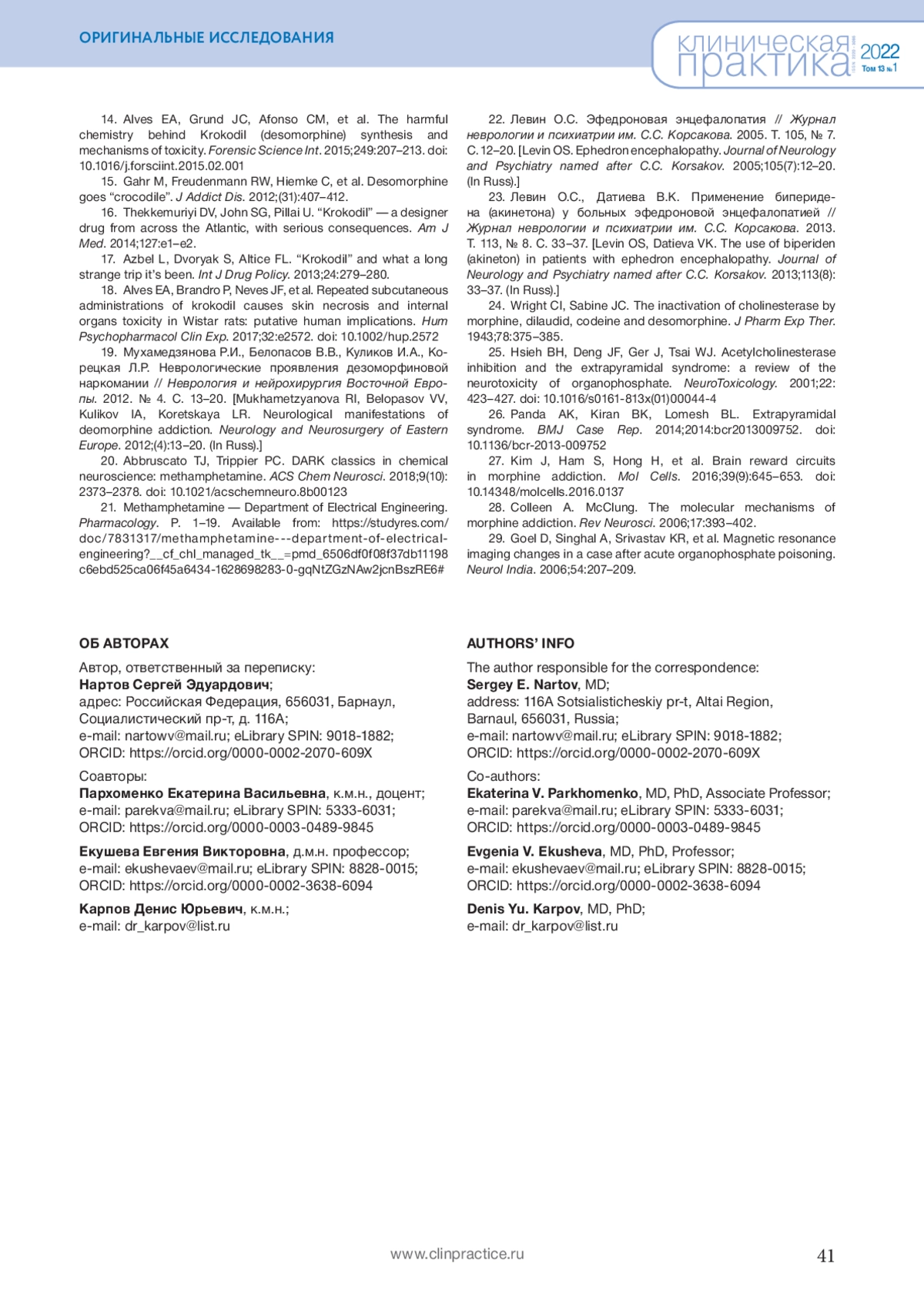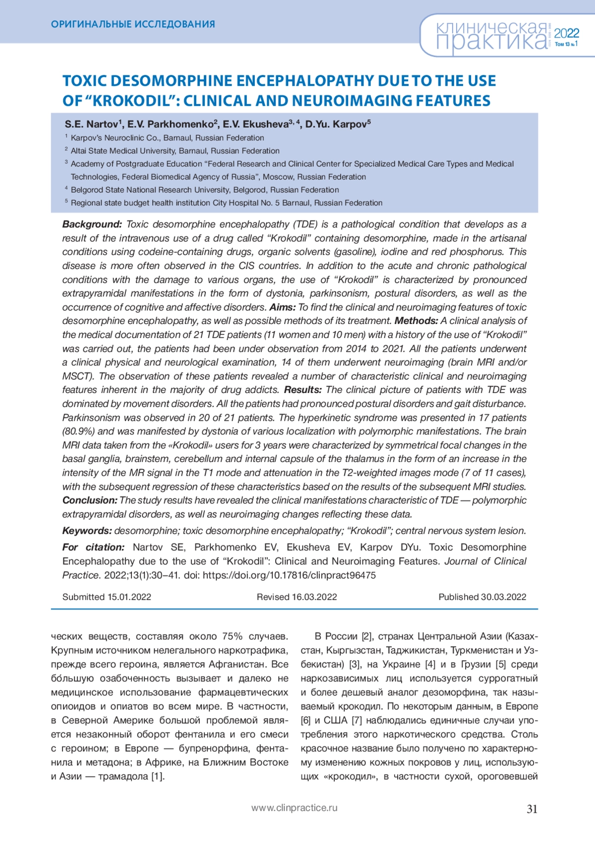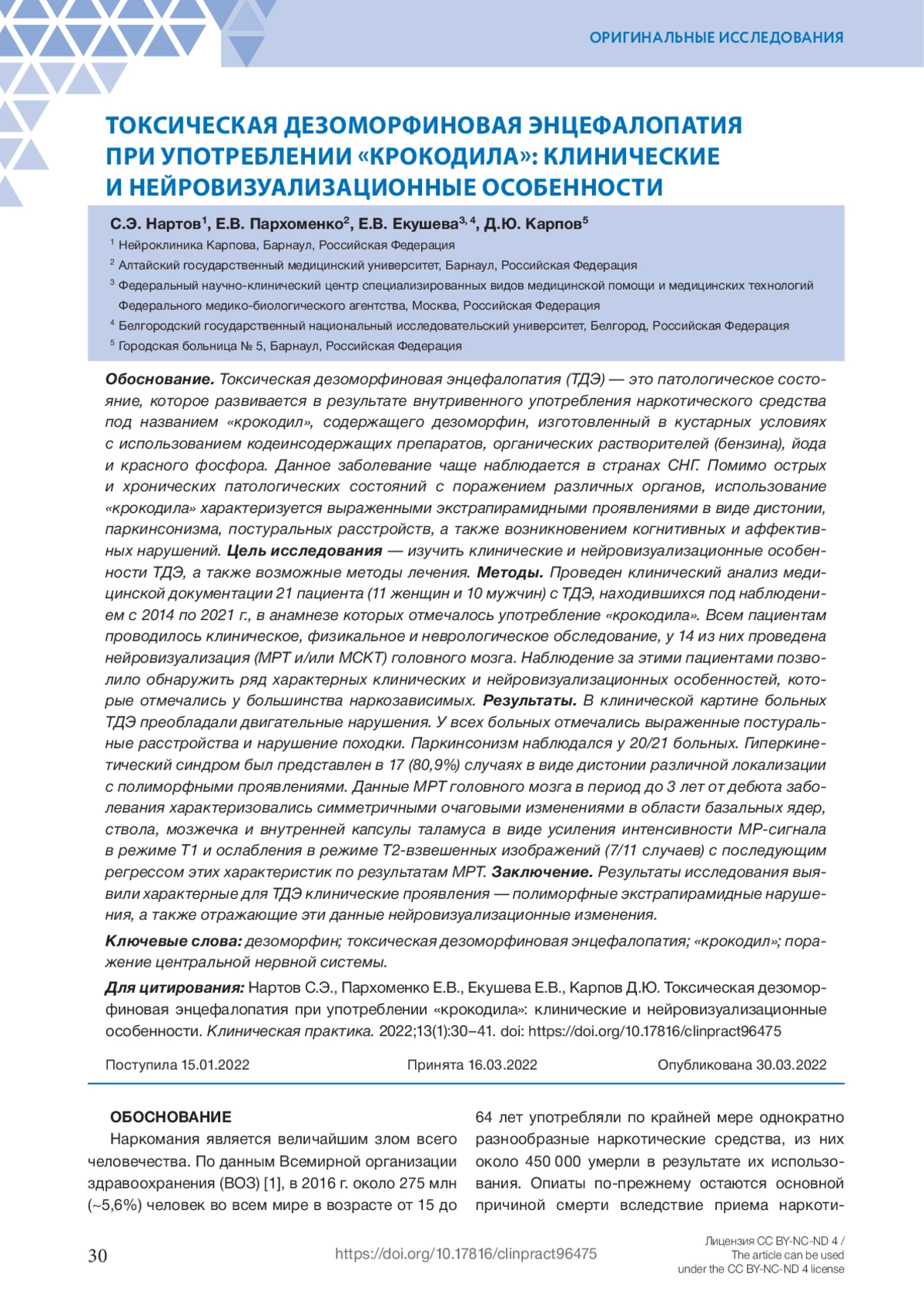 НАРТОВ С. Э. ТОКСИЧЕСКАЯ ДЕЗОМОРФИНОВАЯ ЭНЦЕФАЛОПАТИЯ ПРИ УПОТРЕБЛЕНИИ «КРОКОДИЛА»: КЛИНИЧЕСКИЕ И НЕЙРОВИЗУАЛИЗАЦИОННЫЕ ОСОБЕННОСТИ