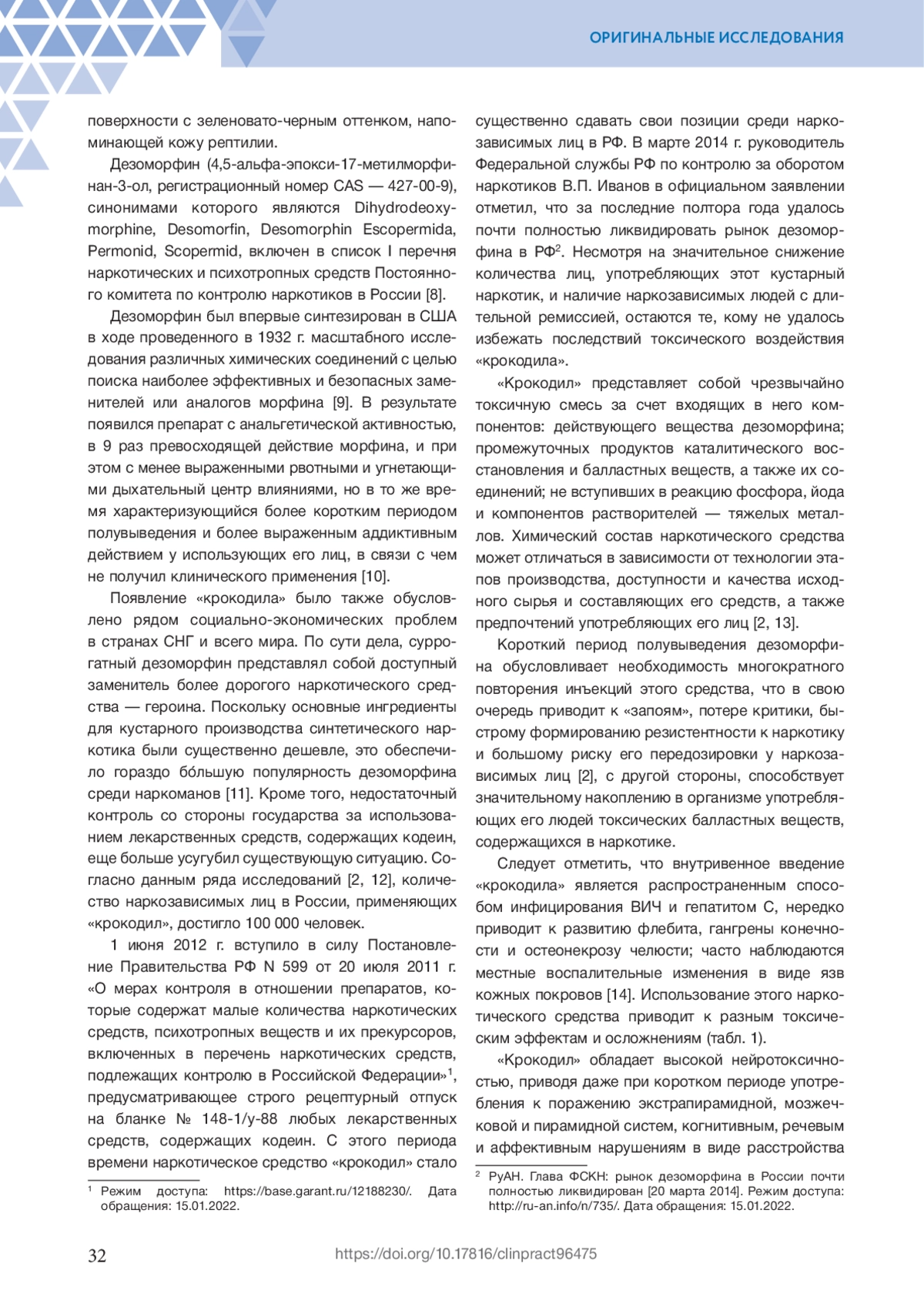 Статья: ТОКСИЧЕСКАЯ ДЕЗОМОРФИНОВАЯ ЭНЦЕФАЛОПАТИЯ ПРИ УПОТРЕБЛЕНИИ «КРОКОДИЛА»: КЛИНИЧЕСКИЕ И НЕЙРОВИЗУАЛИЗАЦИОННЫЕ ОСОБЕННОСТИ