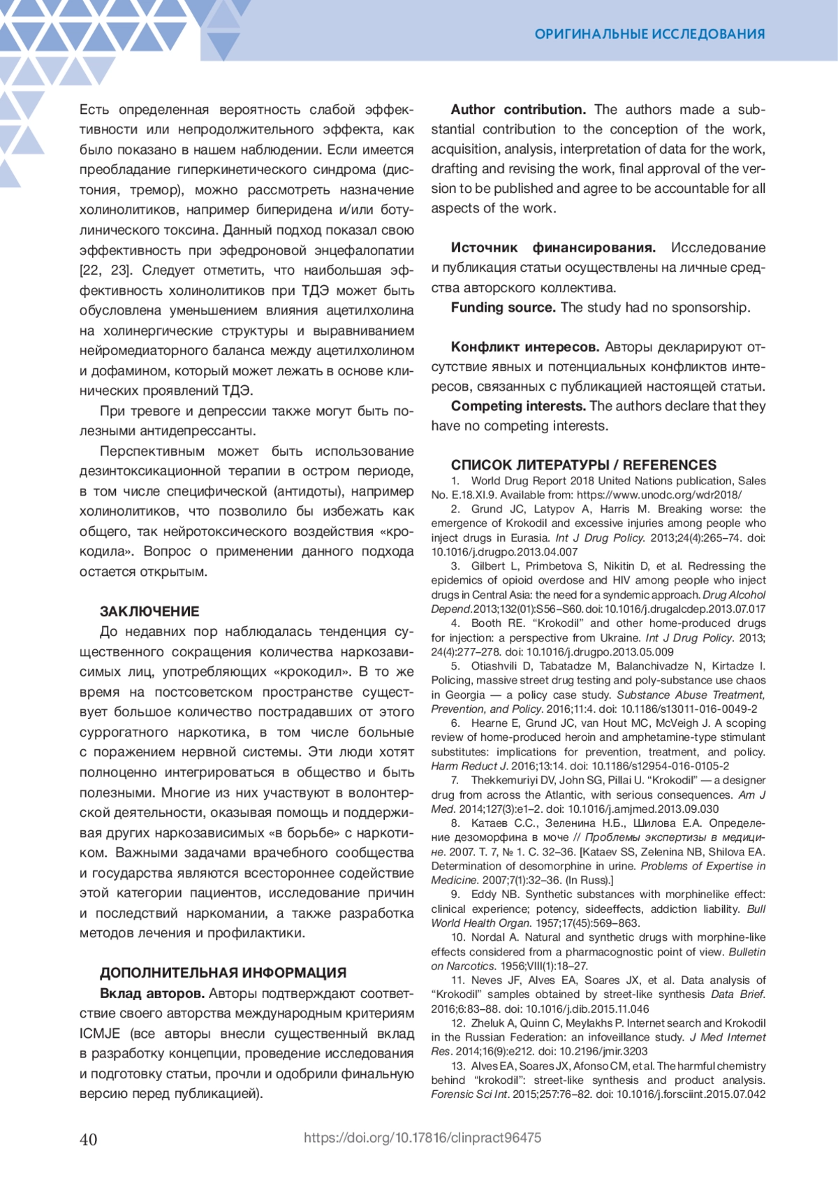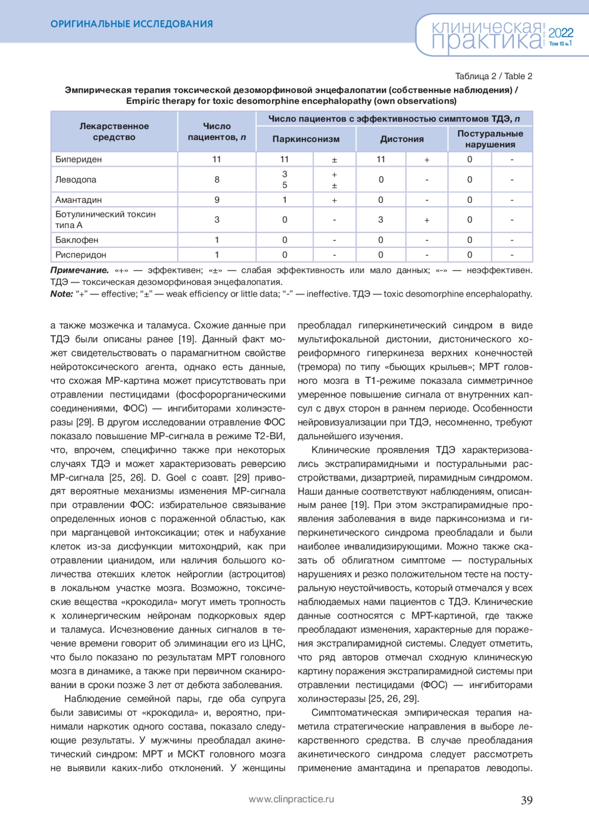 Обоснование. Токсическая дезоморфиновая энцефалопатия (ТДЭ) — это патологическое состояние, которое развивается в результате внутривенного употребления наркотического средства под названием «крокодил», содержащего дезоморфин, изготовленный в кустарных условиях с использованием кодеинсодержащих препаратов, органических растворителей (бензина), йода и красного фосфора. Данное заболевание чаще наблюдается в странах СНГ. Помимо острых и хронических патологических состояний с поражением различных органов, использование « крокодила» характеризуется выраженными экстрапирамидными проявлениями в виде дистонии, паркинсонизма, постуральных расстройств, а также возникновением когнитивных и аффективных нарушений.