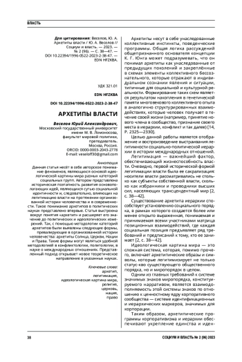 2. Грицков, Ю. В. Архетипические составляющие легитимности власти / Ю. В. Грицков, Д. В. Львов // Социум и власть. - 2017. - № 1 (63). - С. 38-42. EDN: YKROHH