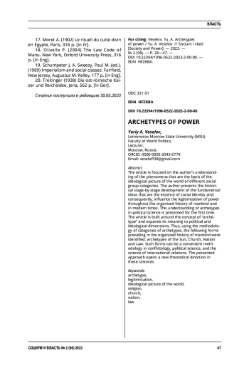 Данная статья несёт в себе авторское понимание феноменов, являющихся основой идеологической картины мира разных категорий социальных групп. Автором представлена историческая поэтапность развития основополагающих идей, являющихся сутью социальной идентичности и, следовательно, влияющих на легитимацию власти на протяжении организованной истории человечества и в современности. Такое понимание архетипов в политических науках представлено впервые. Статья выстроена вокруг понятия «архетип» и расширяет его значение до политических и идеологических измерений. Так, с помощью методологии категорий архетипов были выявлены следующие формы, превалирующие в организованной истории человечества: архетипы Солнца, Церкви, Нации и Права. Такие формы могут являться удобной методологией в конфликтологии, политологии, в науке о международных отношениях. Представленный подход открывает новое теоретическое направление в указанных науках.
