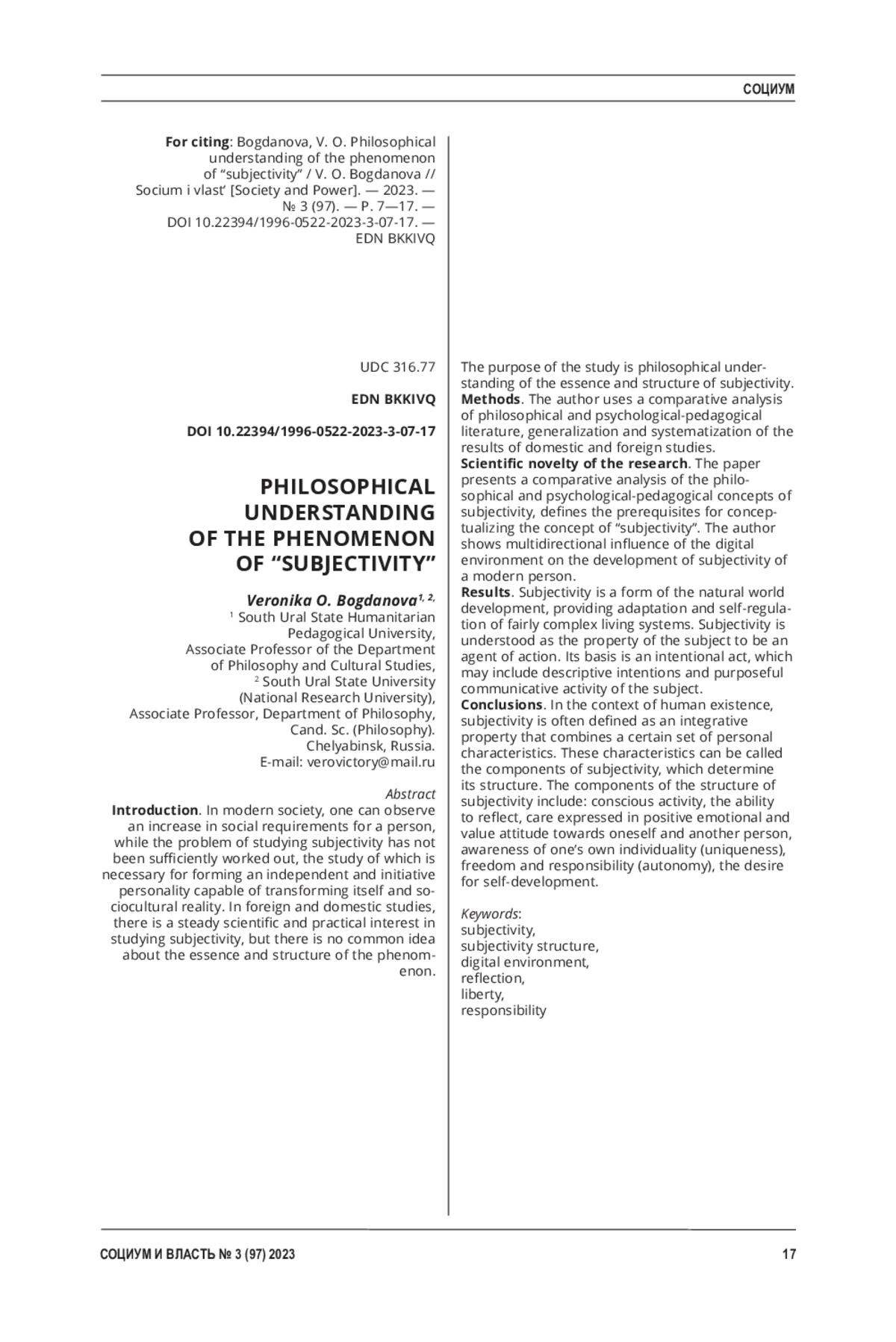 Методы. В исследовании применяется сравнительный анализ философской и психолого-педагогической литературы, обобщение и систематизация результатов отечественных и зарубежных исследований. Новизна исследования. В работе проведен сравнительный анализ философских и психолого-педагогических концепций субъектности, определены предпосылки формирования понятия «субъектность». Показано разнонаправленное влияние цифровой среды на развитие субъектности современного человека.