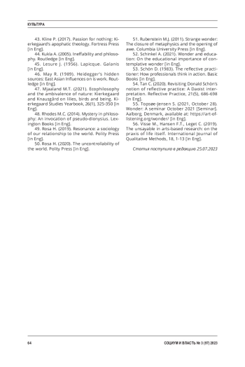 56. Visse M., Hansen F.T., Leget C. (2019). The unsayable in arts-based research: on the praxis of life itself.International Journal of Qualitative Methods, 18, 1-13 [in Eng]. EDN: XBHDPZ