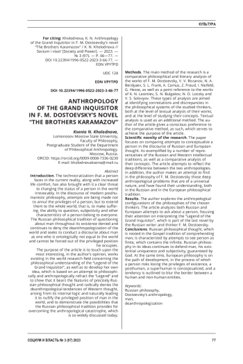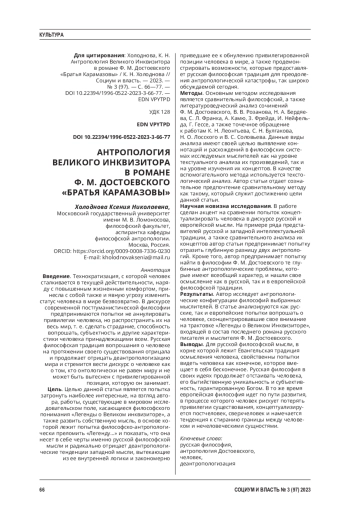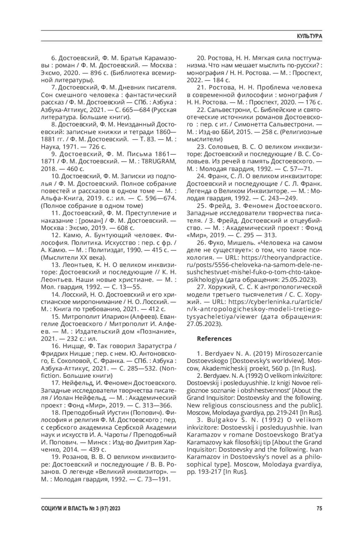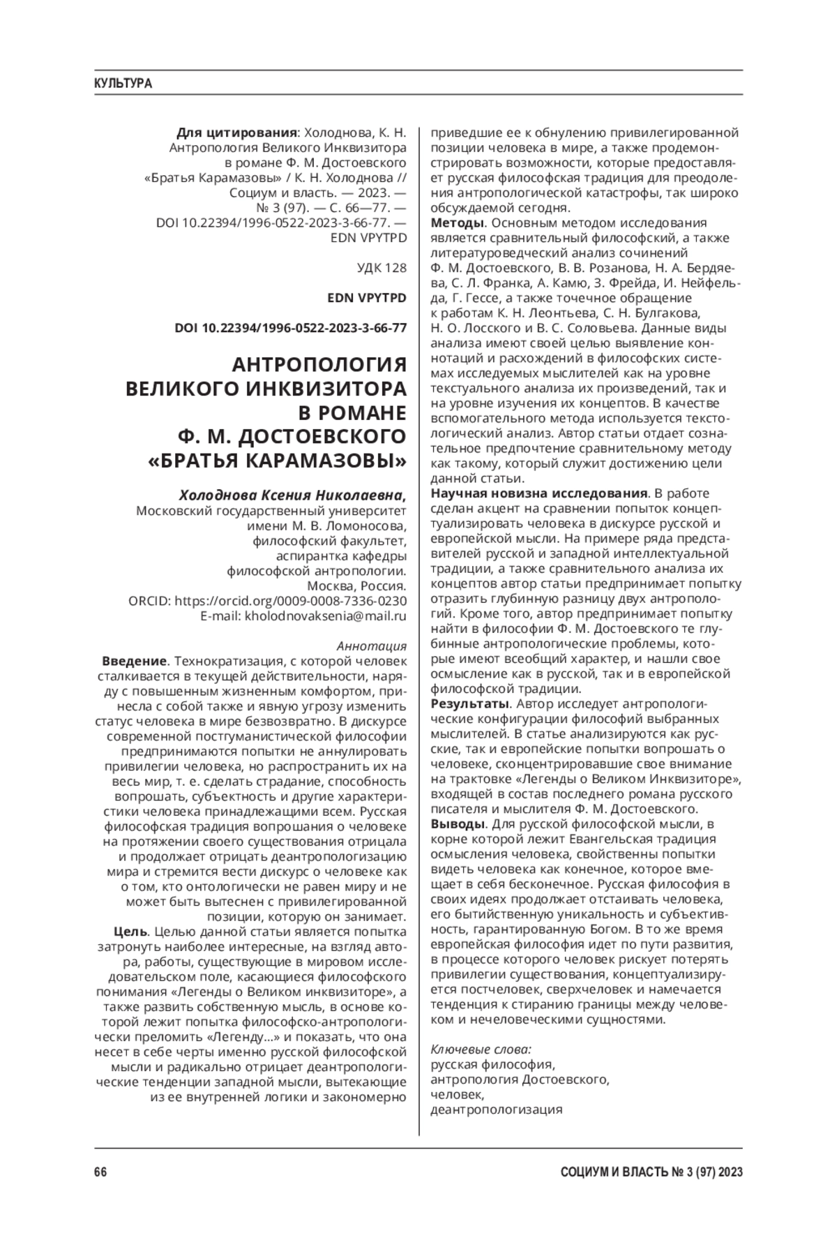 ХОЛОДНОВА К. Н. АНТРОПОЛОГИЯ ВЕЛИКОГО ИНКВИЗИТОРА В РОМАНЕ Ф. М. ДОСТОЕВСКОГО "БРАТЬЯ КАРАМАЗОВЫ" // СОЦИУМ И ВЛАСТЬ. 2023. № 3 (97)