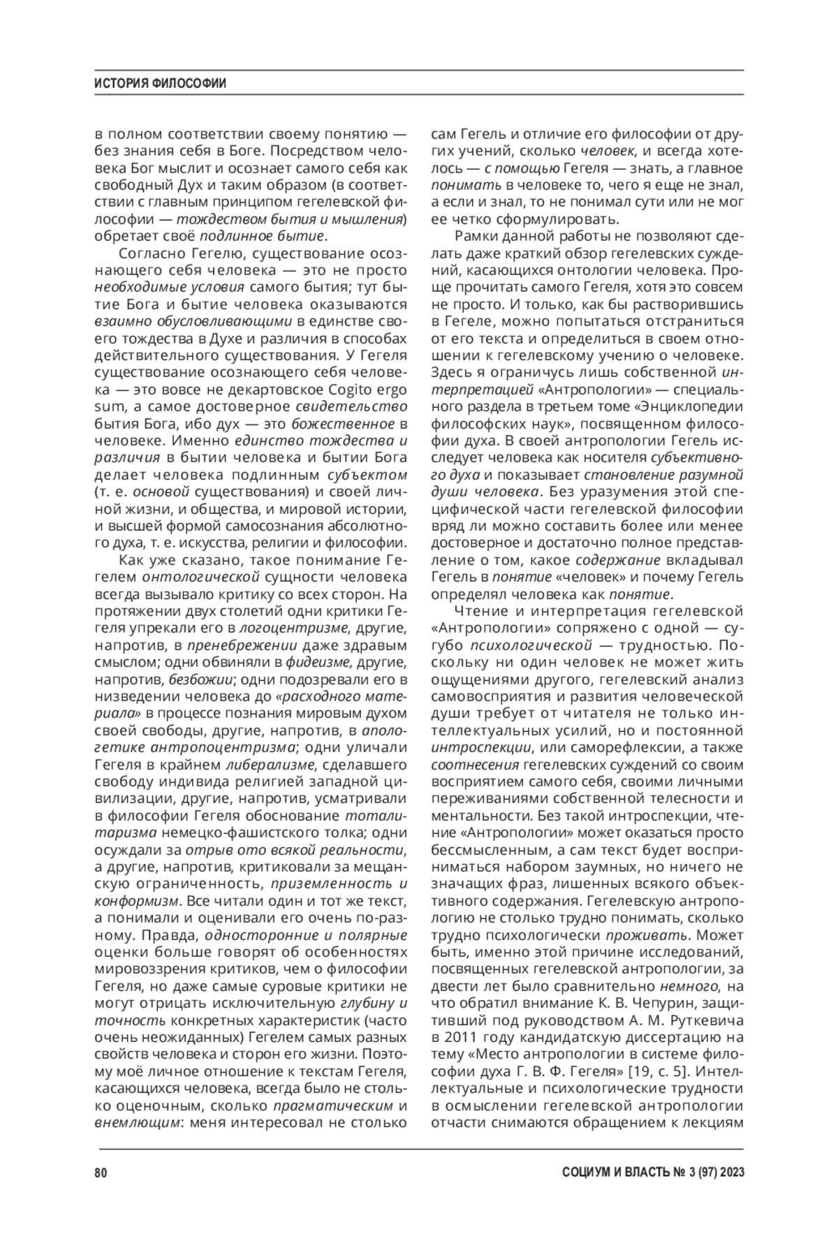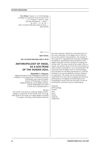 Статья посвящена анализу гегелевской антропологии как учению о душе человека. Прагматическая цель данного исследования состоит в адаптации гегелевских концептов к современной ментальности. Главным методом исследования стала герменевтика как воссоздание основных смыслов гегелевского текста в процессе авторской интерпретации. Новизна исследования состоит в выявлении предельных онтологических оснований, возможностей и границ гегелевского подхода и метода исследования человеческой души. Основной результат исследования - это смысловая и стилистическая ткань текста, содержание которого позволяет сделать вывод как о непреходящей ценности работы Гегеля, посвященной антропологии, инвариантности высказанных в ней идей, так и ограниченности сугубо идеалистического и даже логоцентристского подхода. Статья может быть интересна и полезна как со стороны изучения историко-философской, онтологической и философско-антропологической проблематики, так и с точки зрения преподавания вузовского курса философии.