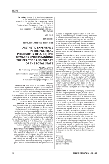 Методы. В качестве методов исследования были использованы герменевтика, сравнительный анализ и деконструкция. Сравнительный анализ позволяет демаркировать собственную линию рассуждений А. Кожева, в контексте эстетических и гносеологический теорий, а также собственно гегельянской тематики. Герменевтика является центральным методом в настоящей работе, так как философия А. Кожева требует истолкования как эстетическая теория. Деконструкция, формализованная до статуса метода по П. де Ману, позволяет обнаружить несостыковки, принцип взаимной проблематизации философии Кожева и актуальной политической и гносеологической повестки. Научная новизна исследования. Стандартным способом трактовки творчества А. Кожева является его оценка как интерпретатора Г. Гегеля. В статье предпринята попытка проанализировать некоторое отдельное от разъяснения текста Г. Гегеля значение философии А. Кожева. Новизна состоит не только в том, что философия А. Кожева определяется как идущее дальше технической герменевтики (ясное изложение) теоретизирование, но и как специфическое представление такого теоретизирования, как гносеоэстетической теории. Последнее - довольно редкая интерпретация философии А. Кожева. Это позволяет расширить традиционное предположение о том, что постгегелевская гносеоэстетика достояние крайне ограниченного числа авторов (например, Б. Кроче). Более того, подобная трактовка теорий А. Кожева является новым элементом в формирующейся тенденции рассмотрения политической проблематики в рамках гносеоэстетики.