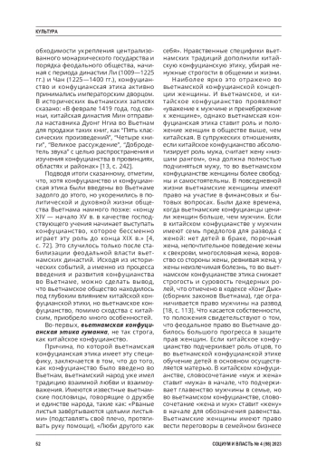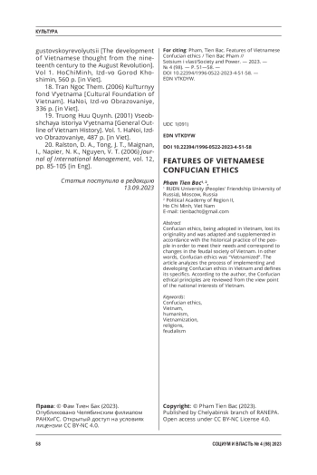 Конфуцианская этика, когда она была принята во Вьетнаме, то потеряла свою первозданность и была адаптирована и дополнена в соответствии с исторической практикой народа, чтобы удовлетворить его потребности и соответствовать изменениям в феодальном обществе Вьетнама. Иными словами, конфуцианская этика была «вьетнамизирована». В статье анализируется процесс внедрения и развития конфуцианской этики во Вьетнаме и определяется ее специфика. По мнению автора, принципы конфуцианской этики были переосмыслены с позиции интересов вьетнамской нации и народа.