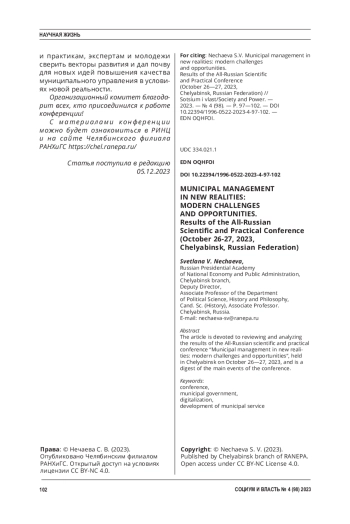 Статья посвящена обзору и анализу итогов Всероссийской научно-практической конференции «Муниципальное управление в новых реалиях: современные вызовы и возможности», состоявшейся в г. Челябинске 26-27 октября 2023 г., и представляет собой дайджест основных мероприятий конференции.