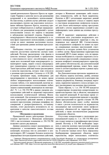 Материалы и методы: материалами послужили Дополнительные протоколы I и II 1977 г. и Дополнительный протокол III 2005 г. к Женевским конвенциям 1949 г. в преломлении к положениям ст. 356 УК РФ. В исследовании применялись методы анализа, сравнения и синтеза для выявления наиболее значимых положений международных норм и их преломления к содержанию диспозиции указанного состава преступления.